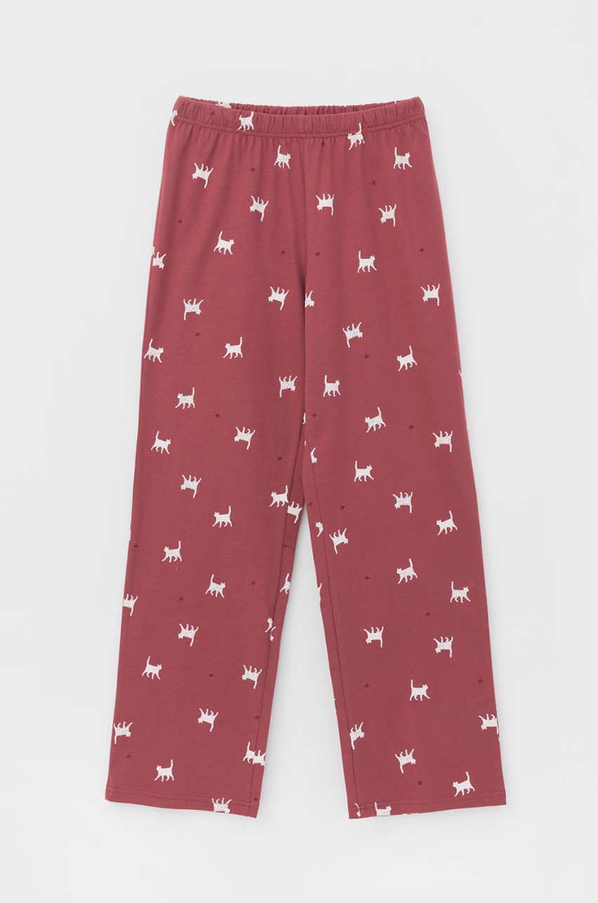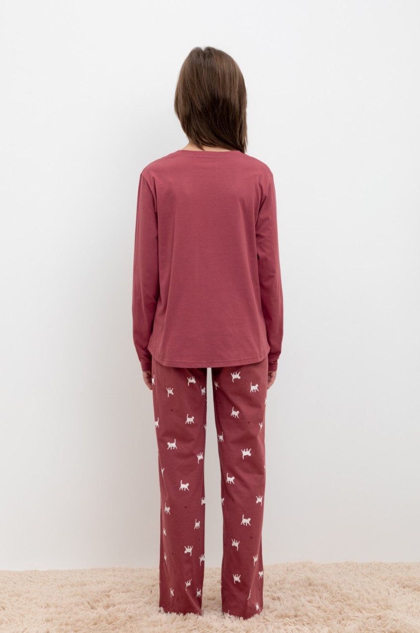 Трикотажный пижамный комплект из натурального хлопка. У джемпера длинные втачные рукава. Брюки с удобным поясом на резинке. Оригинальная набивка и принт выполнены из стойких, гипоаллергенных текстильных красителей.