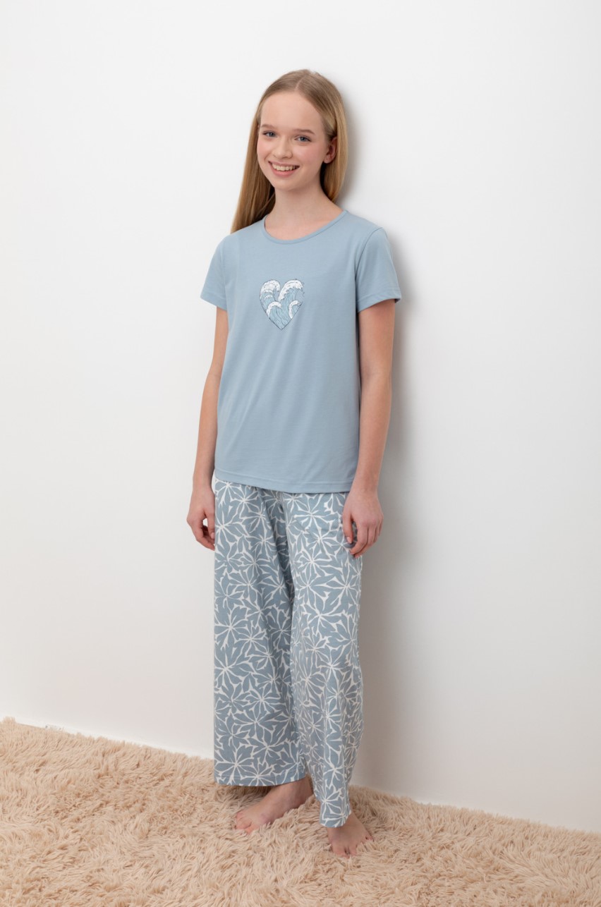 Трикотажный пижамный комплект из натурального хлопка. В комплекте футболка с короткими рукавами и со спущенными плечами. Укороченные брюки с удобным поясом на резинке. Оригинальная набивка и принт выполнены из стойких, гипоаллергенных текстильных красителей.