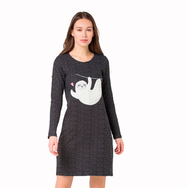 Платье для девочек, домашнее из хлопкового фактурного жаккарда темно-серого цвета. Длинные рукава и круглая эластичная горловина. Впереди аппликация с ленивцем. Длина выше колен.