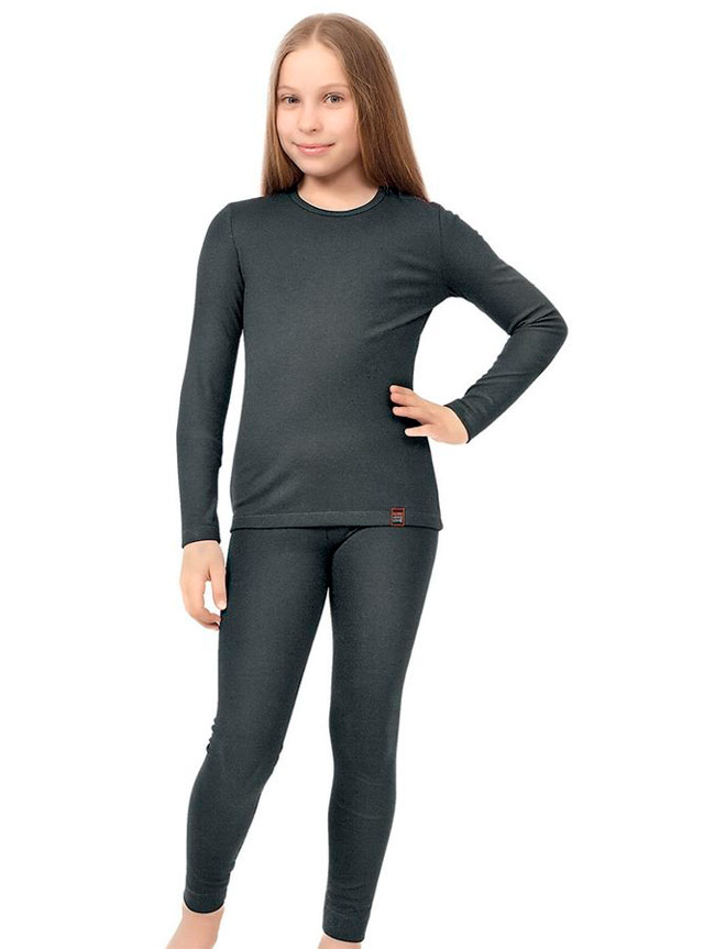 Термокомплект из плотного трикотажного полотна с хорошей гигроскопичностью: лосины, плотнооблегающие ногу, и джемпер небольшого объема. Комплект украшен каучуковой нашивкой по низу джемпера. Удобен в холодное время года.