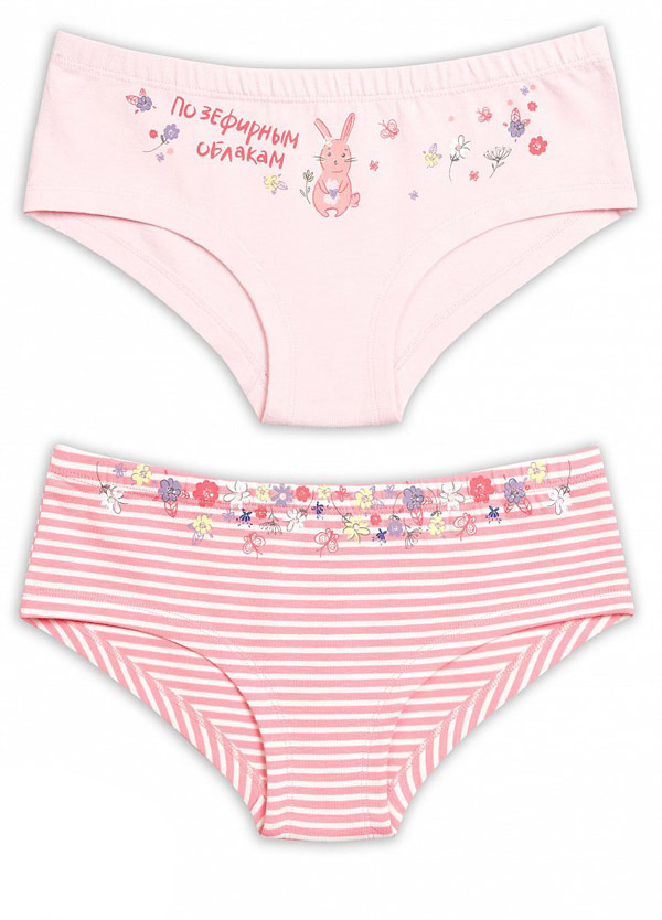 Трусики-шортики средней посадки для девочек. Трусы выполнены в нежной персиковой цветовой гамме с милым принтом зайчика и цветочными узорами. Пояс изделия декорирован бантиком.