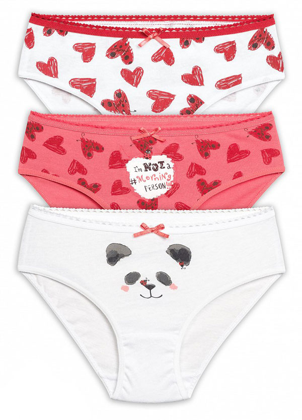 Трусики-слипы из хлопка для девочек. Новая конструкция трусов: увеличена высота трусов по переду и спинке, боковой шов. Линия выреза по ноге по переду более пологая, трусики более закрыты сзади. Слипы выполнены в бело - красной цветовой гамме с милыми принтами - мордочкой панды и сердечками, имитирующими божьих коровок. Пояс изделия декорирован бантиком.