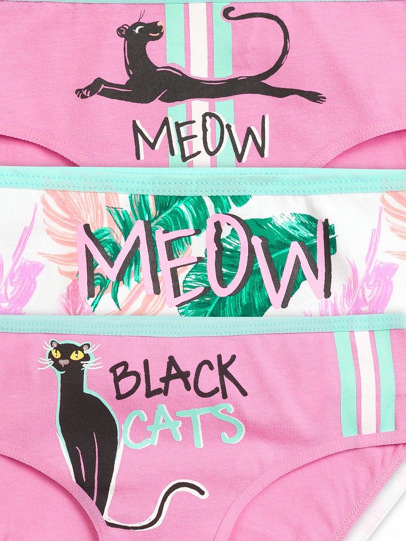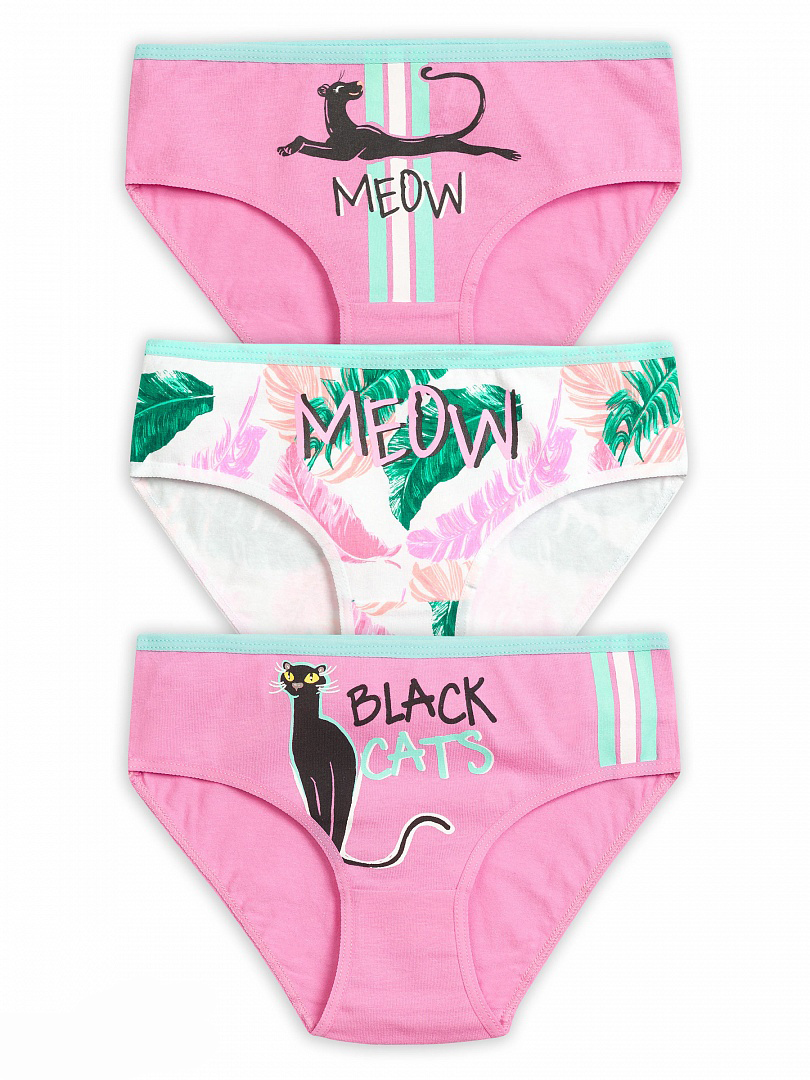 Трусики-слипы для девочек. Принт в стиле неоновых джунглей. Перевод надписей в принте Мяу и Чёрные кошки. По талии обработка контрастным эластиком со сгибом. Обработка эластиком по ноге. Цена указана за одну позицию. При заказе через интернет-магазин указывайте в комментариях цвет изделия.