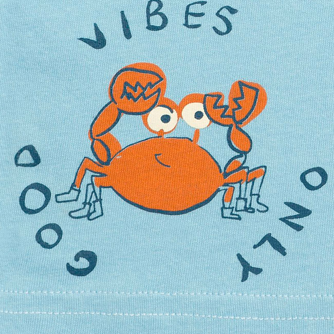 Майка для мальчиков выполнена из трикотажного однотонного хлопка голубого цвета. Классическая майка на широких лямках. Внизу на передней части изделия принт - заводной краб.