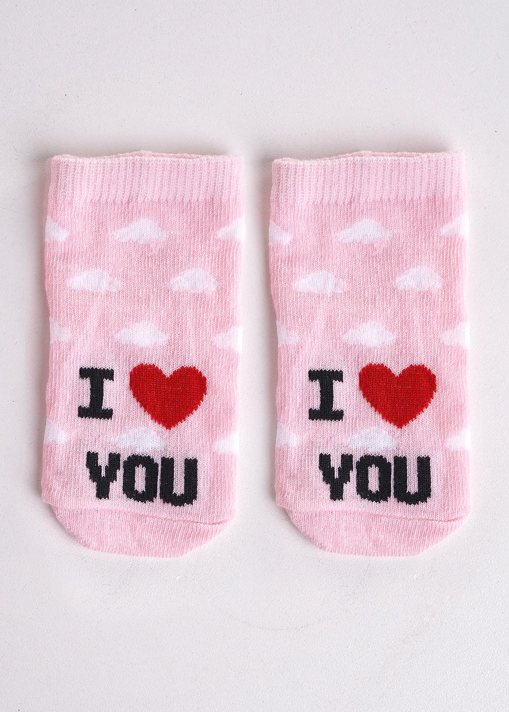 Детские носки для ясельной возрастной группы, розового цвета, с изображением надписи "I LOVE YOU" . Выполнены из мягкого трикотажа, что не вызывает дискомфорта при носке, отлично сидят на ножке. После стирки не дают усадку.