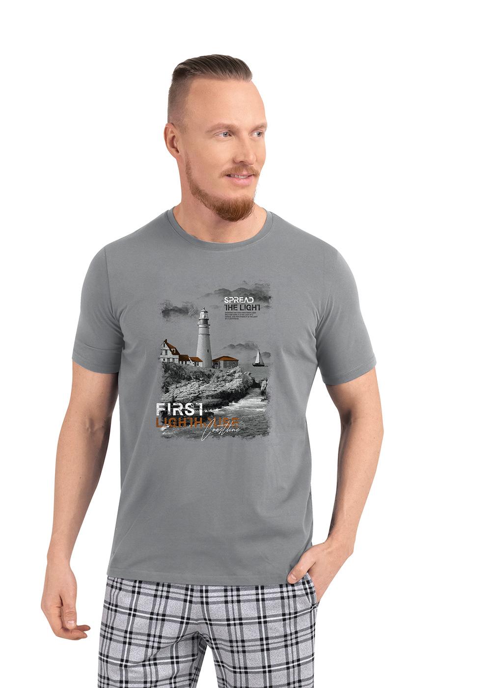 Комплект мужской домашний, состоящий из футболки и шорт. Футболка из трикотажного полотна с круглым вырезом горловины и коротким рукавом дополнена стильным принтом. Шорты из трикотажного полотна на эластичном поясе с функциональными карманами и шнуром.