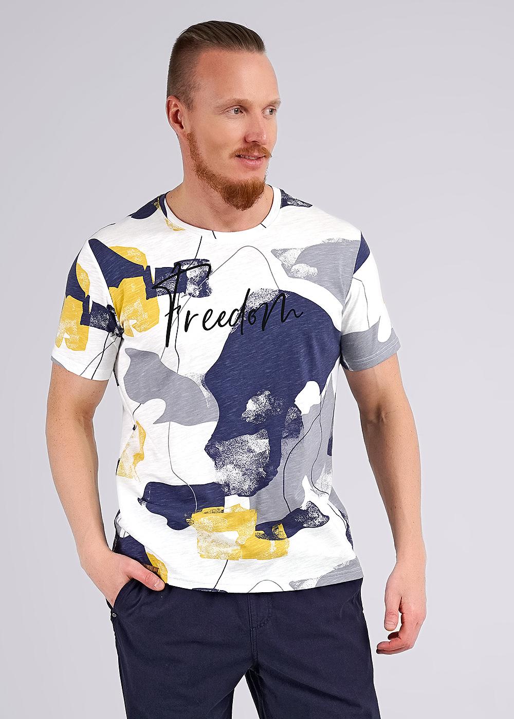 Футболка мужская с круглым вырезом горловины и коротким втачным рукавом из фактурного полотна "флам" с яркой набивкой . Футболку дополняет принт по груди и имиджевая фурнитура. Подойдет для прогулок с друзьями.