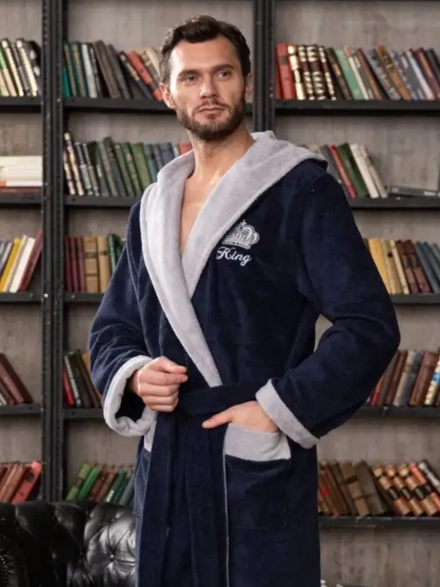 Современная классическая мужская модель халата "KING" с капюшоном. Контрастная отделка по капюшону, Элегантный и стильный халат смотрится шикарно, поэтому ее по достоинству оценят все представителе сильного пола.