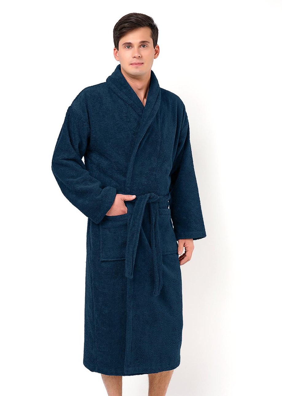 Классический мужской махровый халат с приспущенной линией плеча. По бокам расположены карманы и предусмотрен функциональный пояс. Благодаря высокому качеству обеспечит непревзойденный комфорт и удобство для повседневного использования дома, в бане или в бассейне.
