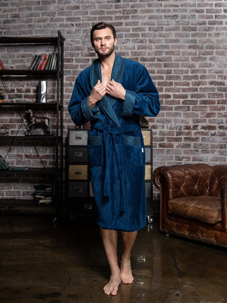 Халат мужской велюровый с шалевым воротником, изготовлен из мягкой ткани Трига/хлопок, внутренняя сторона махра.