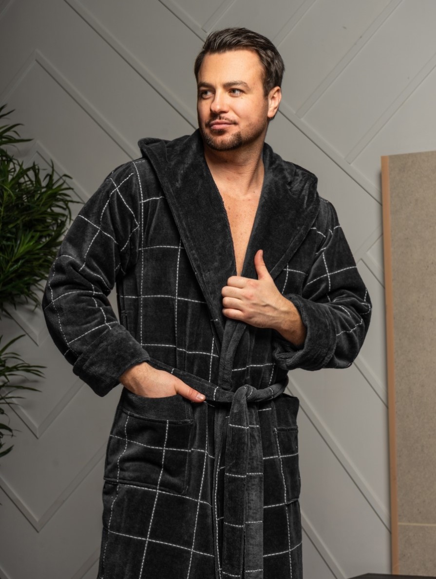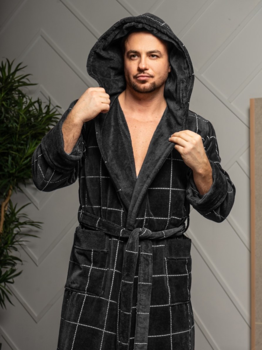 Мужской банный халат "KEVIN" с капюшоном из 100%-го хлопка, который изготовлен из нитей высшего качества. Текстурный жаккард в виде крупной клетки привнесет торжественности и оригинальности в привычную атмосферу домашнего уюта, поэтому ее по достоинству оценят настоящие любители комфорта. Мы всегда используем в своих изделиях дорогие высококачественные материалы: лицевая сторона халата велюровая, благодаря этому халат теплый и мягкий. Внутренняя сторона халата махровая, поэтому отлично впитывается влага. Халат имеет классический фасон с характерным свободным кроем на запах с поясом. Манжеты на рукавах отворачиваемые, регулируемые. Шлевки для пояса двухуровневые, для регулировки по росту. Карманы накладные, глубокие.