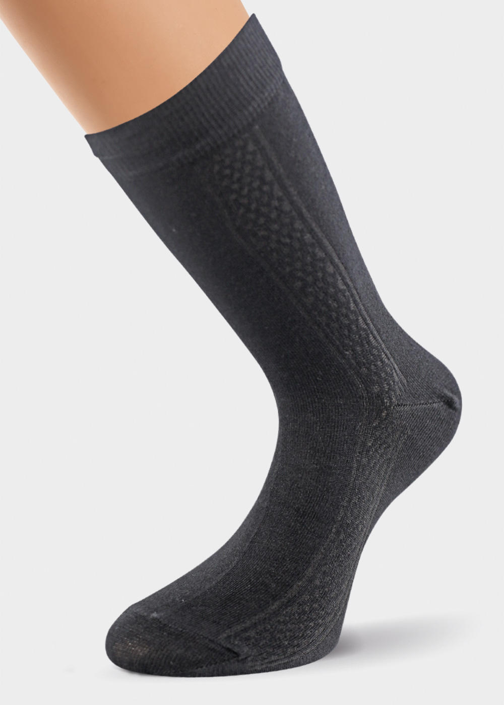 Длинные, классические мужские носки черного цвета, с рельефным рисунком. На голени эластичная резинка.