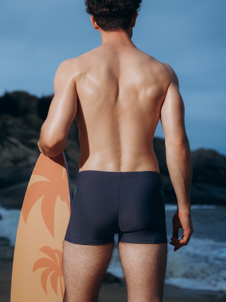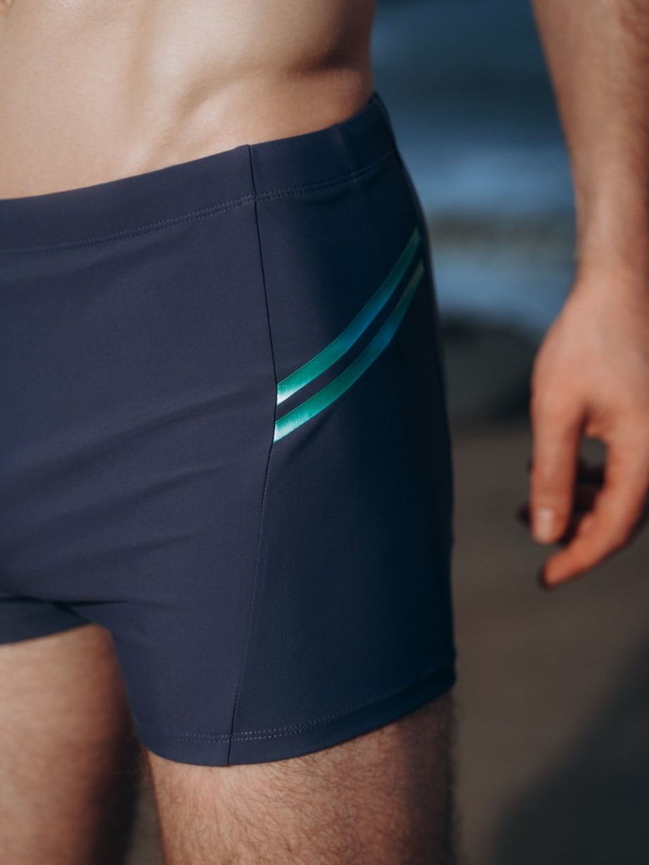 Мужские плавки, изготовленные из полиамида, выполнены в сером цвете. На внутренней части плавок имеется подкладка с двумя нижними вырезами. На талии широкая эластичная резинка с регулирующим шнурком внутри. По бокам плавки украшены принтом в зеленую полоску.