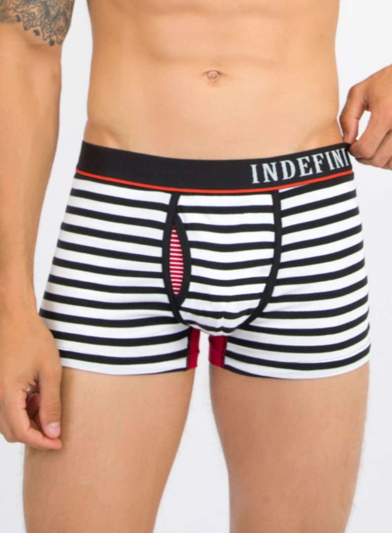 Мужские трусы от торговой марки Индефини. Трусы-боксеры из хлопка, белого цвета, с принтом в полоску, со вставками красного цвета, на мягкой резинке.