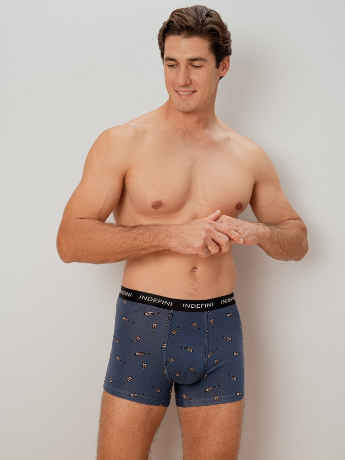 Мужские трусы боксеры зготовлены из хлопкового материала. На талии имеется мягкая эластичная резинка, фиксирующая трусы без давления и не оставляющая следов. Трусы боксеры выполнены в классическом синем цвете и украшены принтом с изображением бутылок.