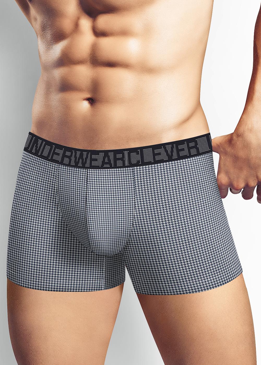 Шорты средней длины комфортной посадки выполнены из оригинального полотна с узором "гусиной лапки". Трусы дополнены имиджевой жаккардовой резинкой.