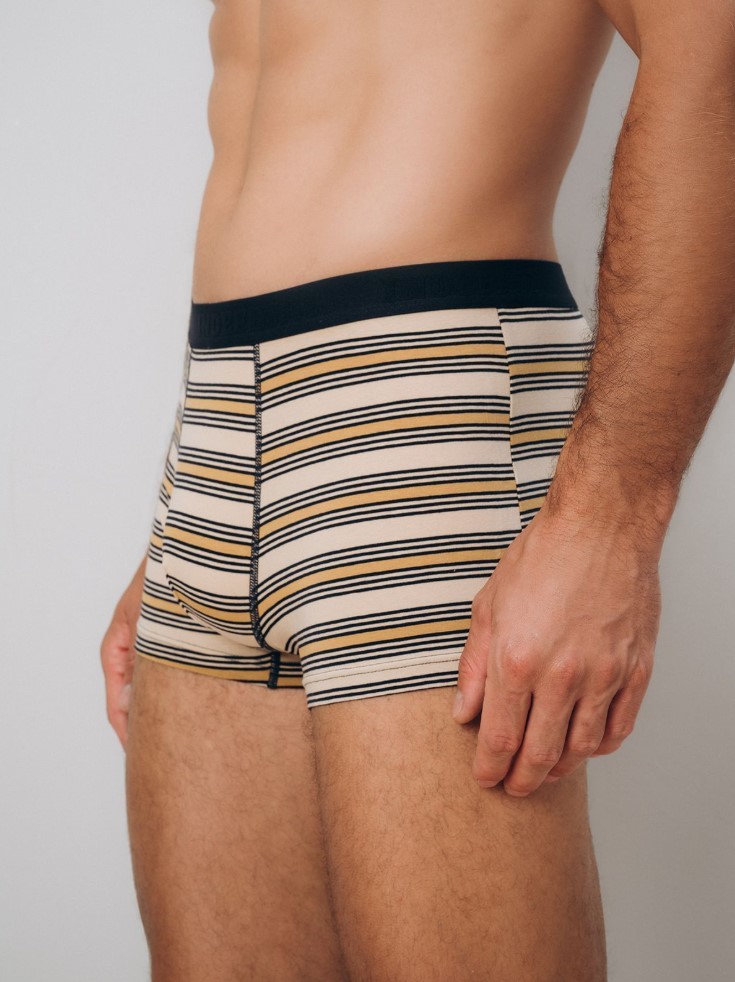 Мужские трусы боксеры изготовлены из хлопка и выполнены в бежевом цвете с принтом в полоску. Трусы средней посадки имеют на талии мягкую эластичную резинку.
