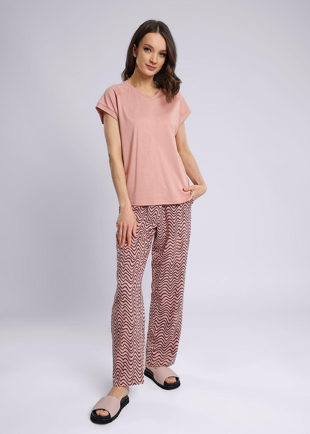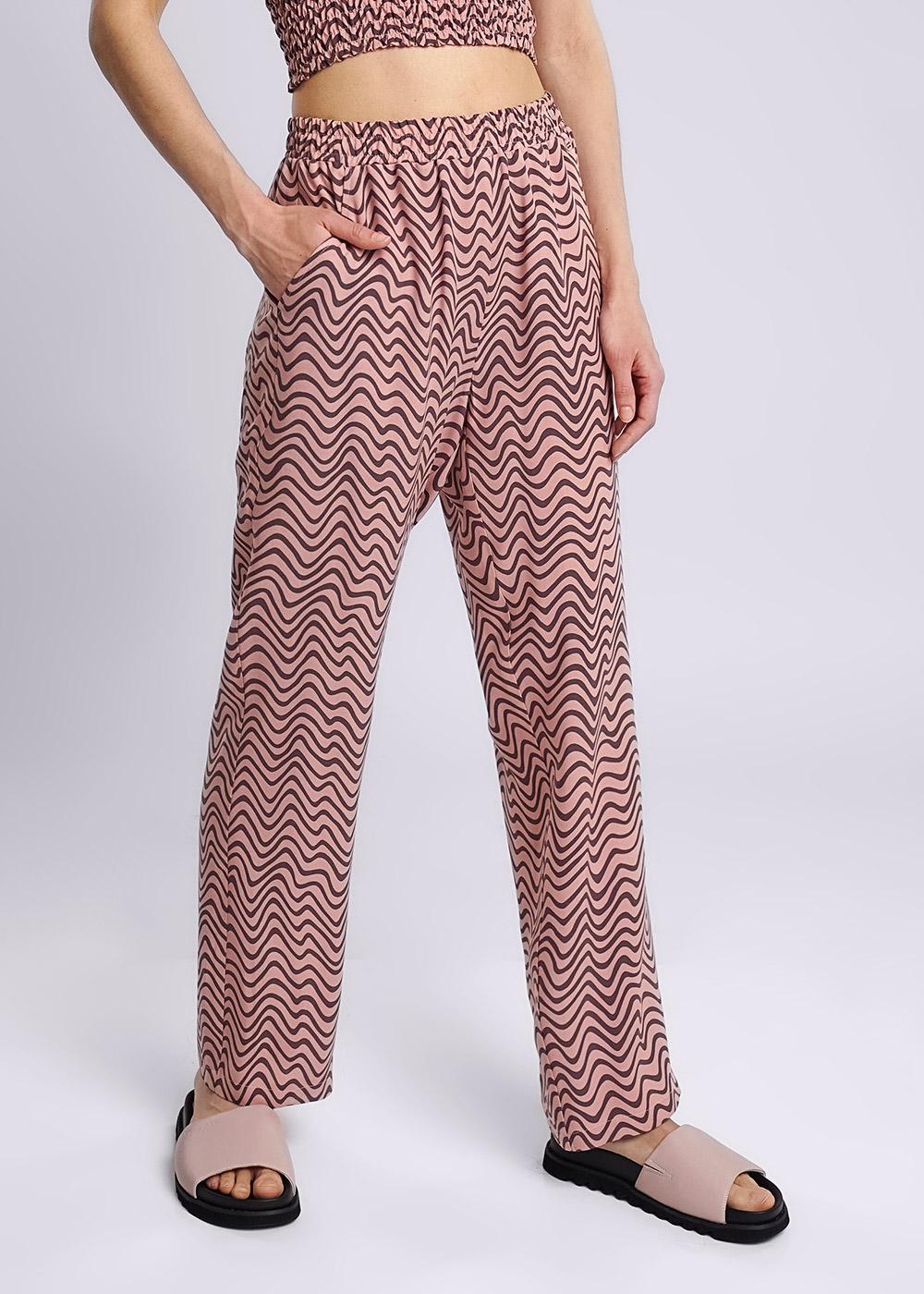 Брюки из штапеля прямого кроя. Притачной пояс на внутренней резинке. По бокам карманы. Завершает дизайн жаккардовая нашивка.