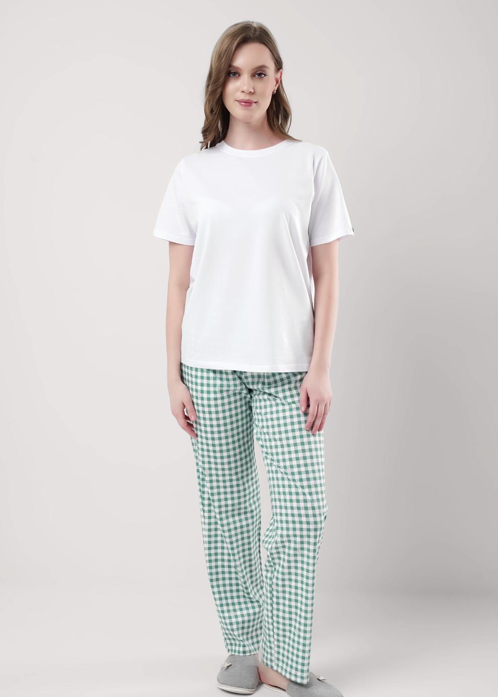 Брюки прямые для дома из хлопкового трикотажного полотна. Пояс на внутренней резинке, боковые карманы с отрезным бочком.