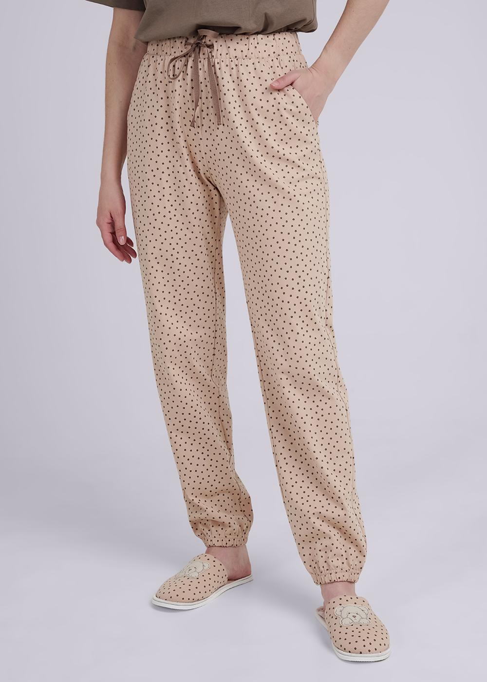 Брюки для дома из трикотажного полотна свободного кроя. Притачной пояс на резинке, со шнуром. Боковые карманы с отрезным бочком. По низу брюк манжеты на резинках.
