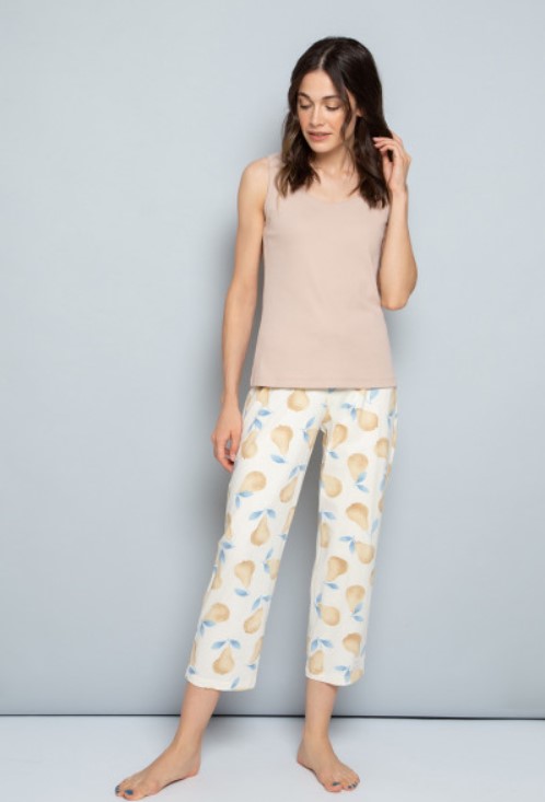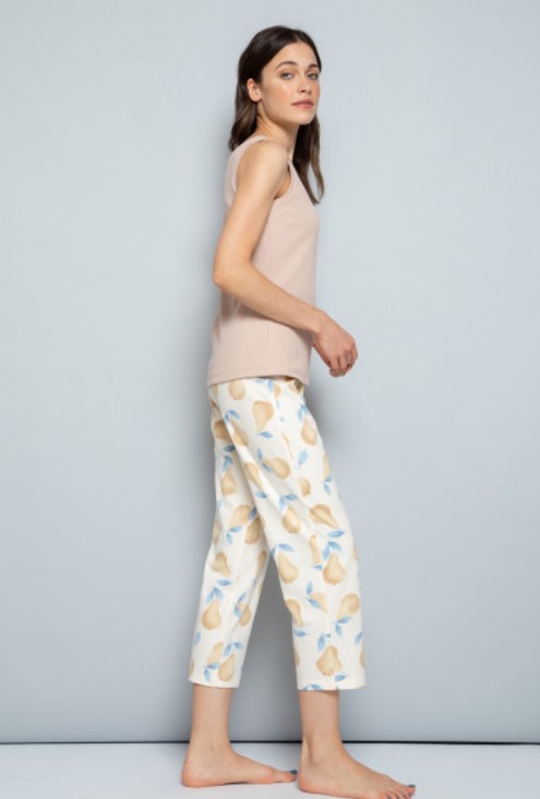 Широкие брюки из набивного супрема с рисунком из груш. В поясе резинка. Регулируются по ширине с помощью блестящей ленты. По низу обработаны плоскими швами.