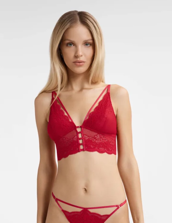 Кружевной бралетт с мягкой чашкой без косточек. Трехступенчатая застежка. Несъемные регулируемые бретели.