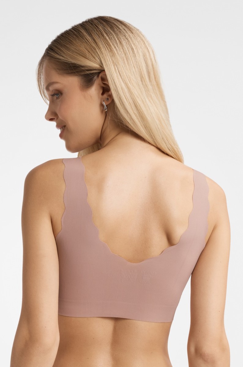 Гладкий бесшовный бюстгальтер-топ с мягкой чашкой со съемными вкладышами, без каркасов. Выполнены из микрофибры в рубчик.