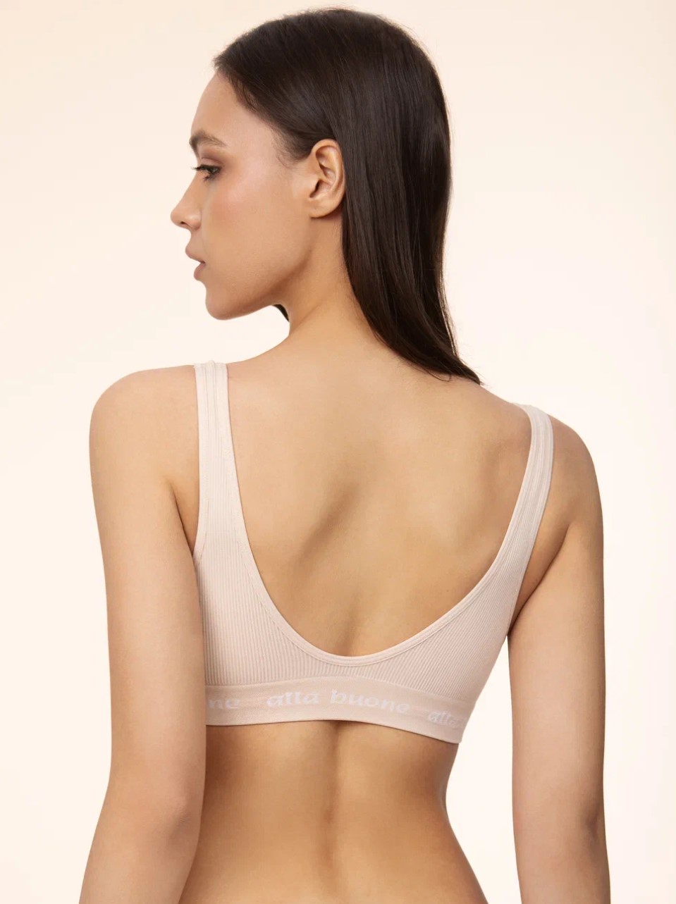 Бесшовный топ бра в рубчик со съемными вкладышами. Мягкая резинка с логотипом бренда Alla Buone обеспечивает комфортную посадку. Размерам (S - M), (L - XL) соответствует чашка "B". Красивое, комфортное и удобное белье высокого качества отлично подходит для повседневной носки и занятий спортом.