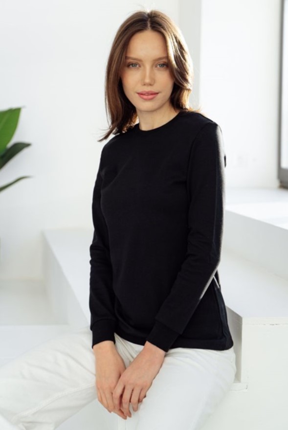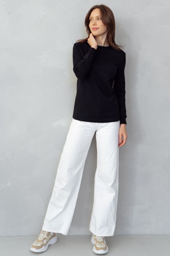 Джемпер из натурального хлопка (интерлок) с круглым вырезом горловины приталенного силуэта и длинным рукавом. Рукава обработаны кашкорсе.