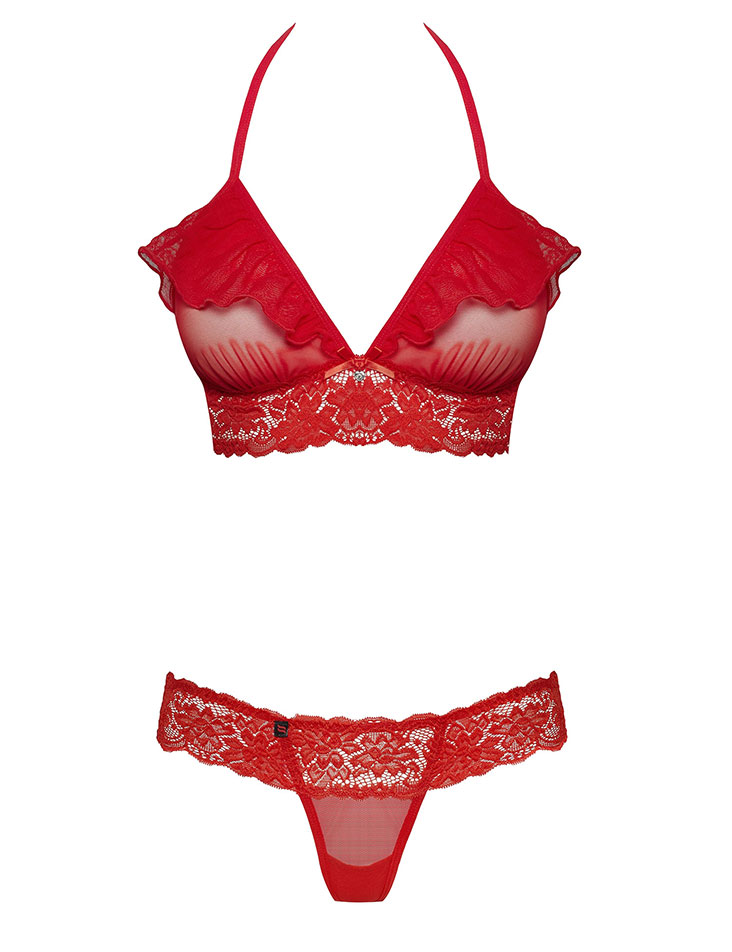 Эротический комплект красного цвета из деликатной полупрозрачной сетки и эластичного кружева, с рюшами.