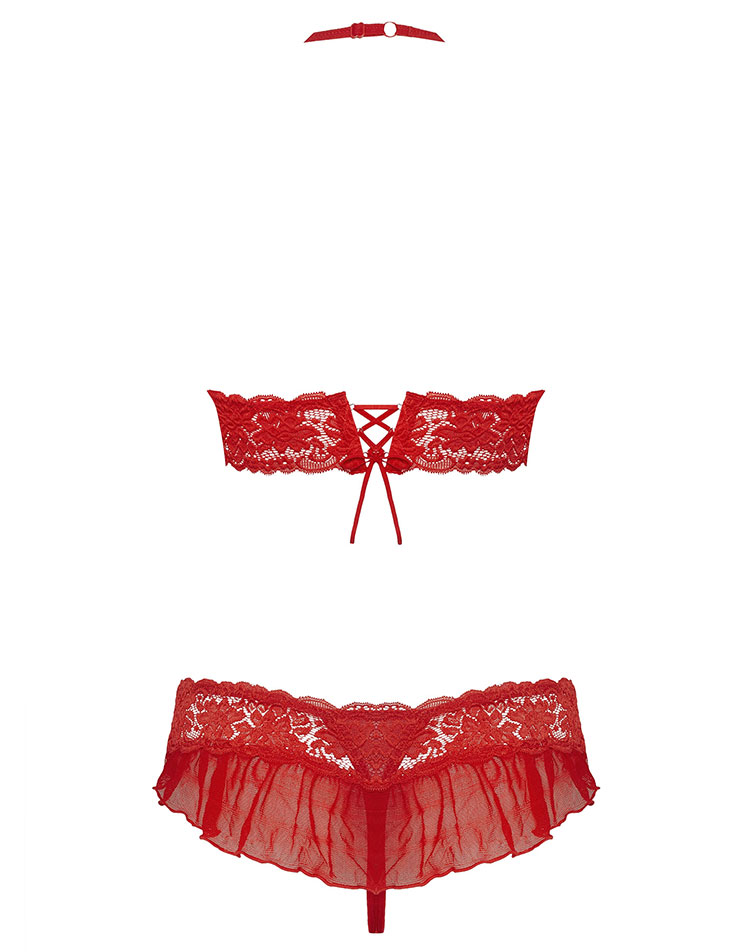 Состоит из бюстгальтера с мягкими чашками без каркасов, с тонкими бретелями через шею, с шнуровкой на спинке и обольстительных трусиков стрингов с кокетливой «юбочкой» на ягодицах.