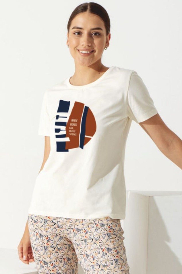 Классическая футболка полуприлегающего силуэта. Рукав короткий, втачной. Вырез горловины круглый. Футболка декорирована тематическим принтом коллекции.