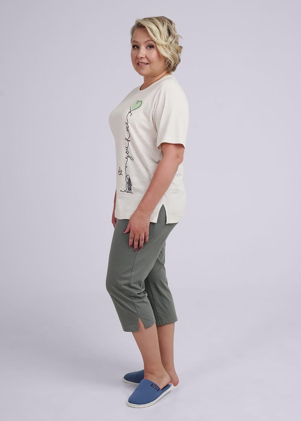 Футболка для дома из хлопкового трикотажного полотна, прямого силуэта. Округлая горловина с обтачкой. Втачной короткий рукав. По бокам разрезы. Спереди принт.