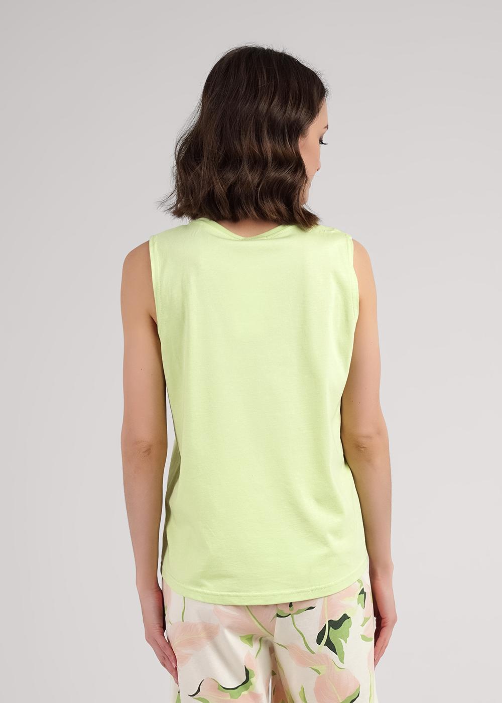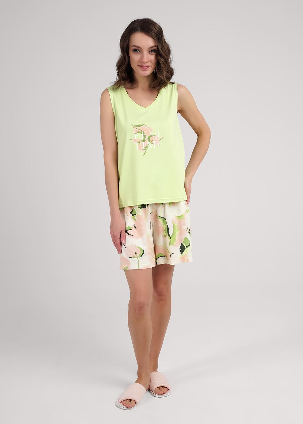 Футболка для дома и отдыха, из трикотажного полотна с добавлением модала с удлиненной спинкой. Без рукавов,широкое плечо. V-образный вырез горловины с обтачкой. Спереди и сзади принт.