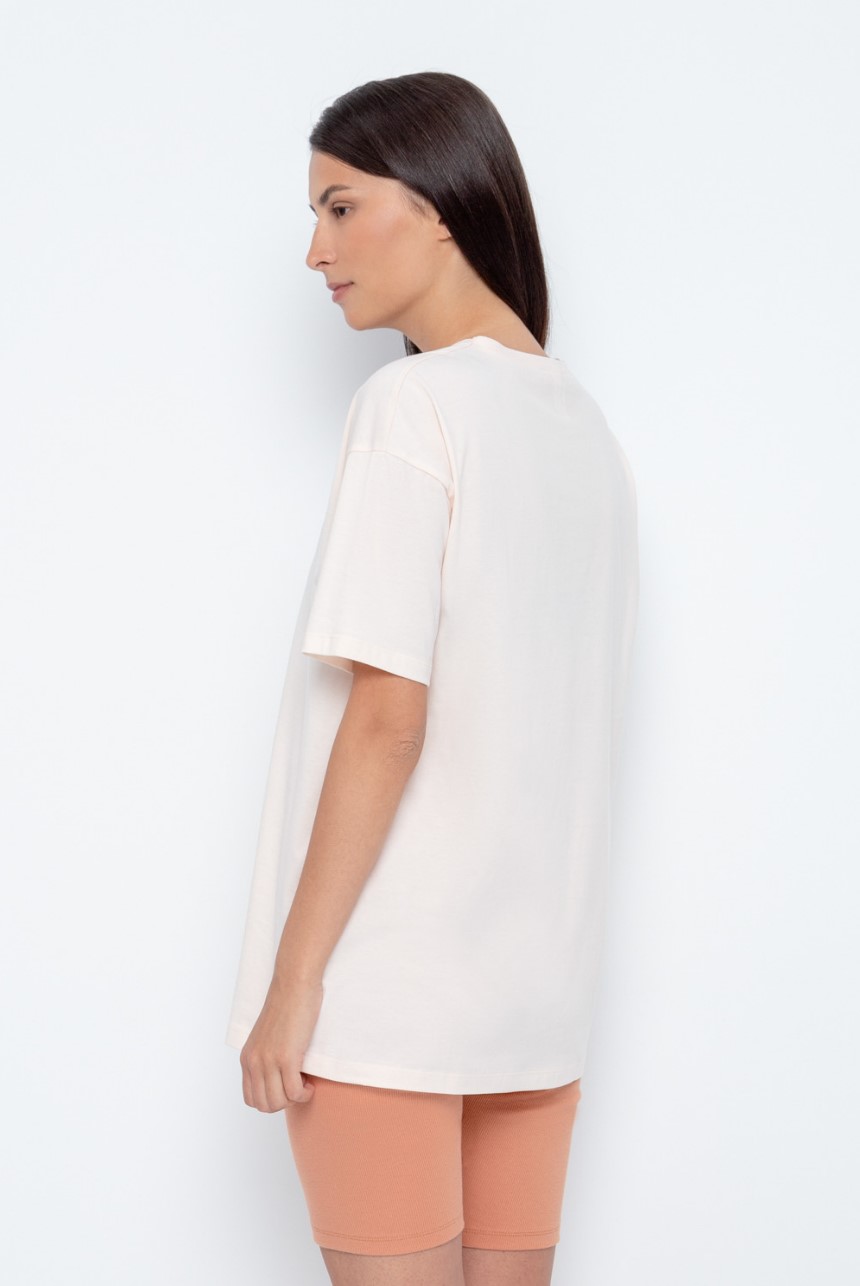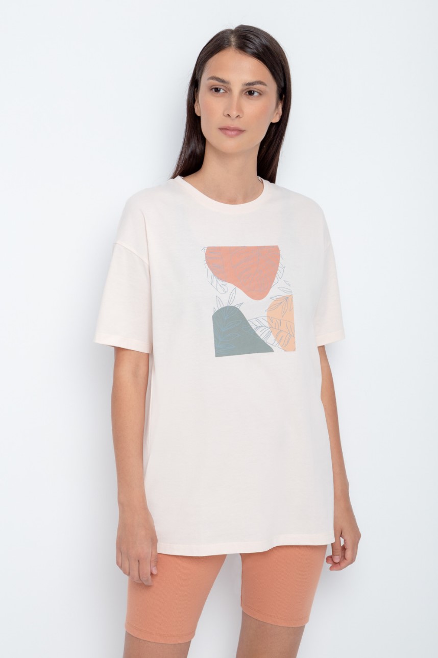 Удлиненная футболка из лёгкого трикотажа супрем. Свободные рукава со спущенной линией плеча создают объём и свободный силуэт. Принт изготовлен из стойких текстильных красителей.