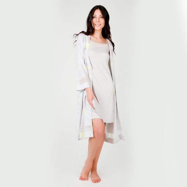 Элегантный женский халат на запах, на поясе, с декором из мягкой сетки на рукавах и по низу изделия. Нежное полотно приятно прилегает к телу и дарит ощущение абсолютного комфорта. Цвет светло-серый, с тематическим цветным рисунком.