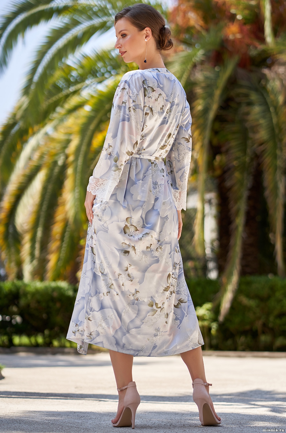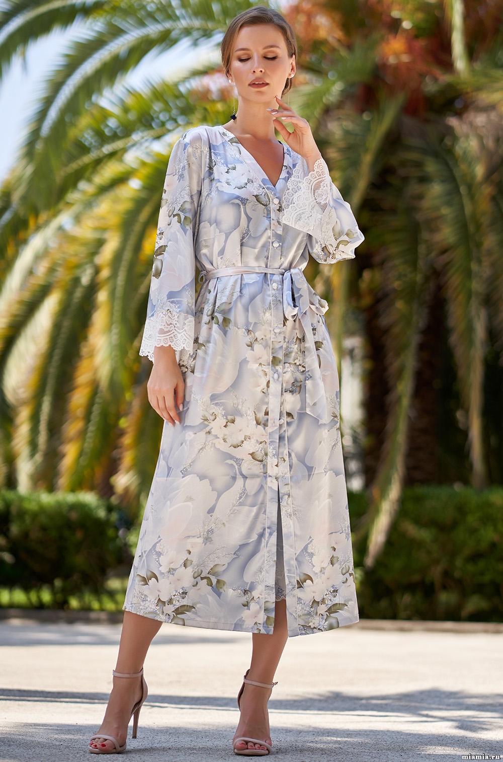 Элегантный длинный халат Mia-Amore на пуговицах и с V-образным вырезом из смесового шелкового полотна с изящным принтом. Низ рукавов ¾ декорирован широкой полосой кружева. Линию борта украшает тонкий кант. Халат на запахе с поясом, в боковых швах есть карманы.
