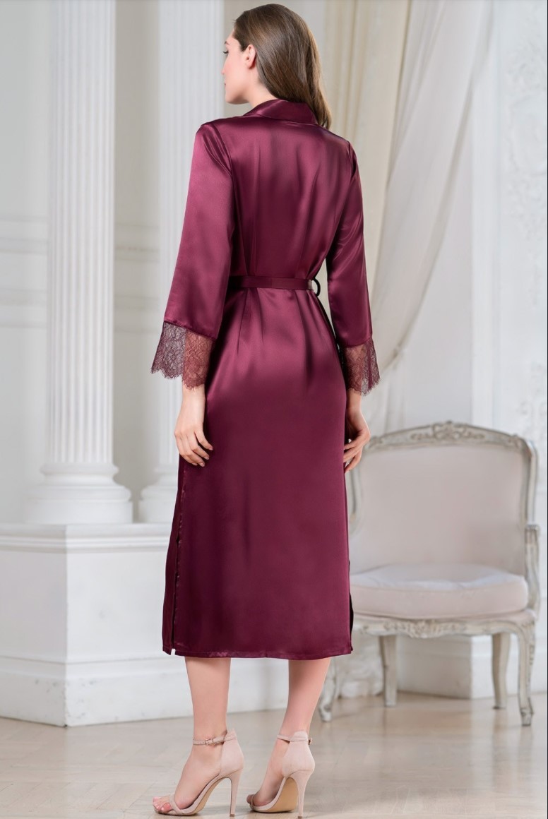 Длинный халат с застежкой на пуговицы Mia-Amore выполнен из смесового однотонного шелка. Низ рукавов и накладные карманы декорированы тонким кружевом. Воротник шалькой подчеркивает элегантные линии халата. Халат дополняет эффектный широкий пояс.