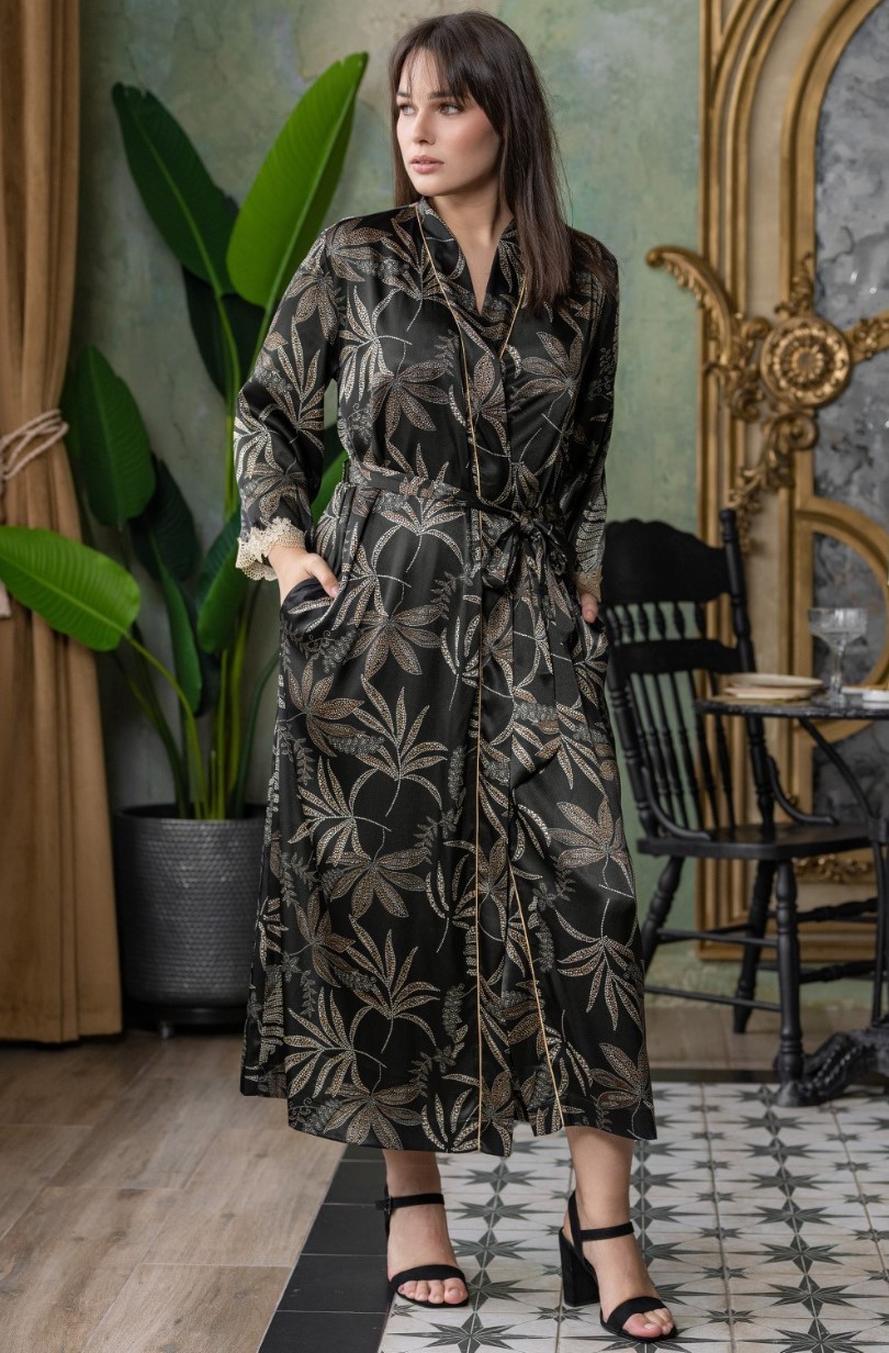 Длинный халат Mia-Amore выполнен из принтованного смесового шелка. Ажурное кружево расположено по низу рукавов, борт халат отделан атласным узким кантиком.