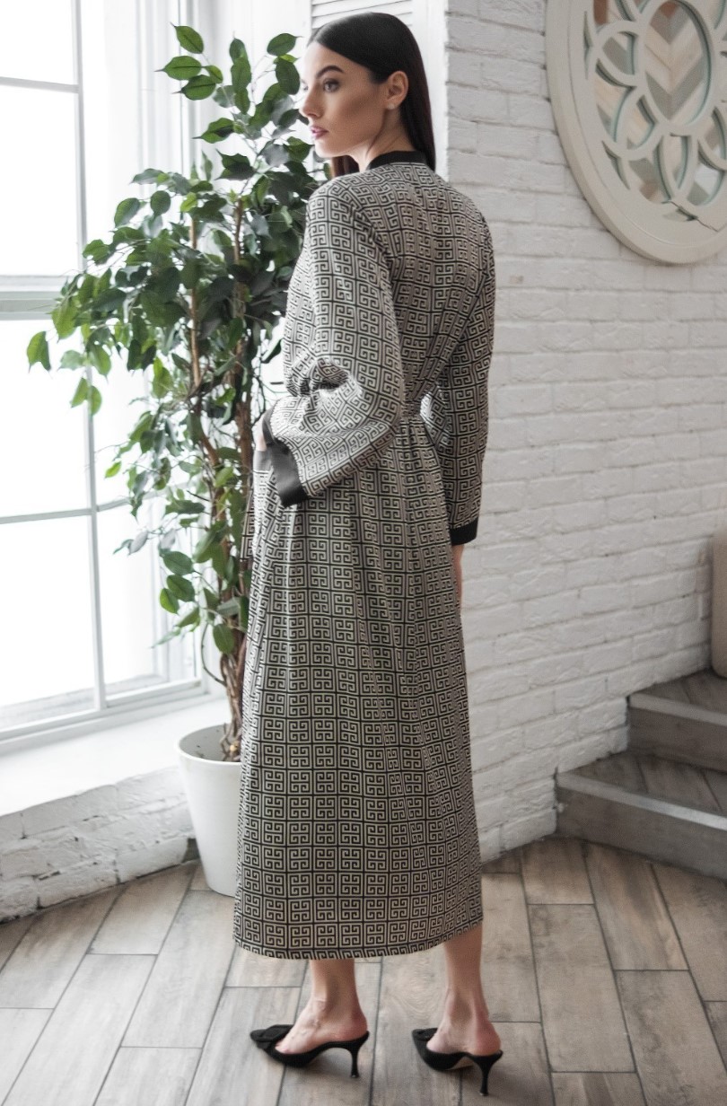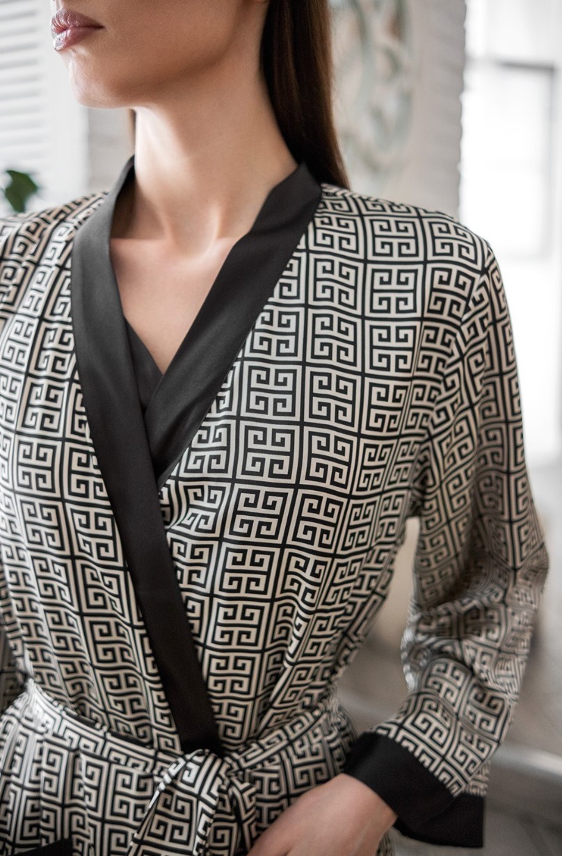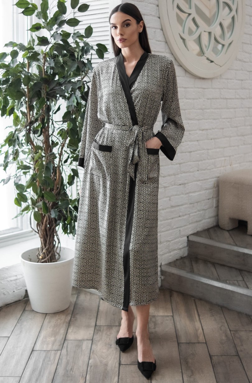 Длинный халат-кимоно Mia-Amore с длинным рукавом. Халат выполнен из принтованного смесового шелка с однотонной отделкой. На полочках расположены накладные карманы.