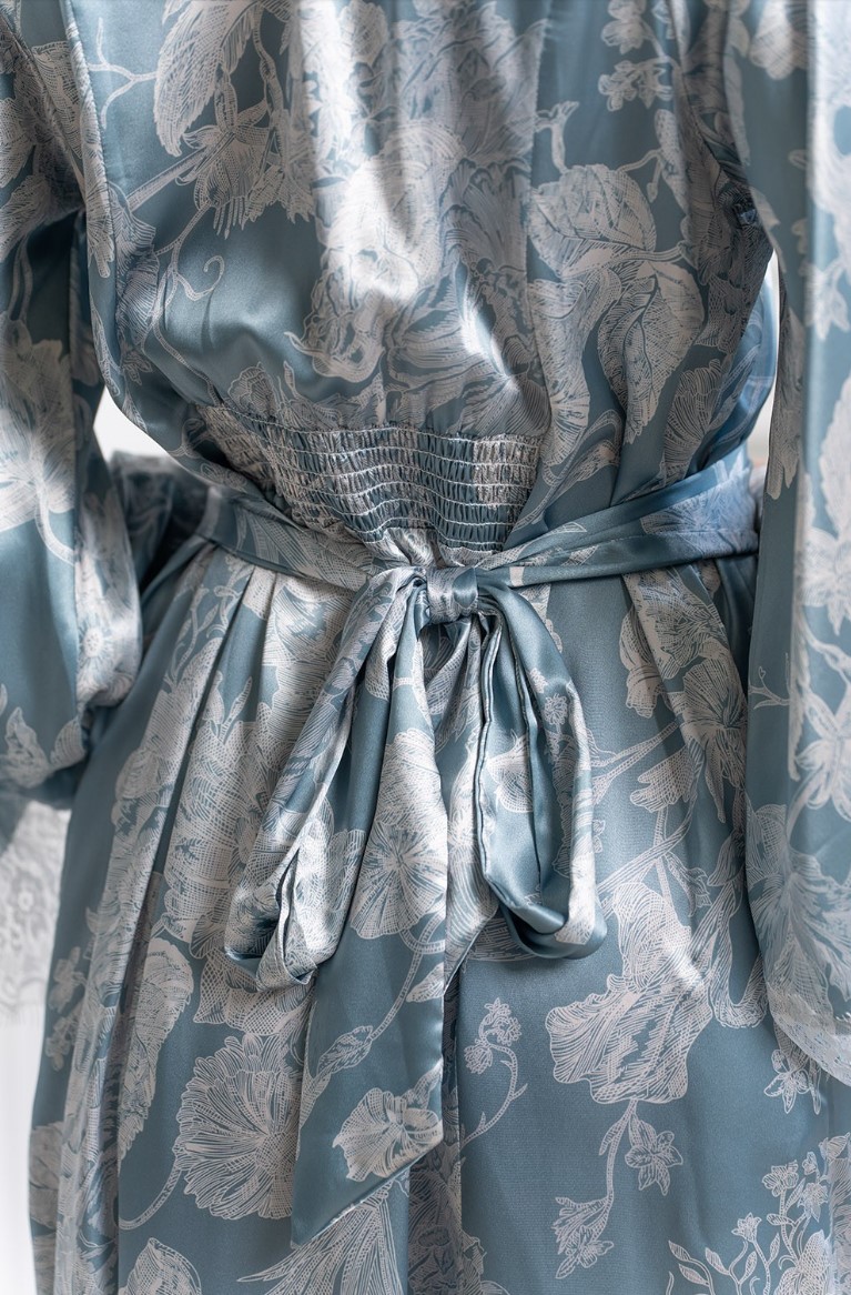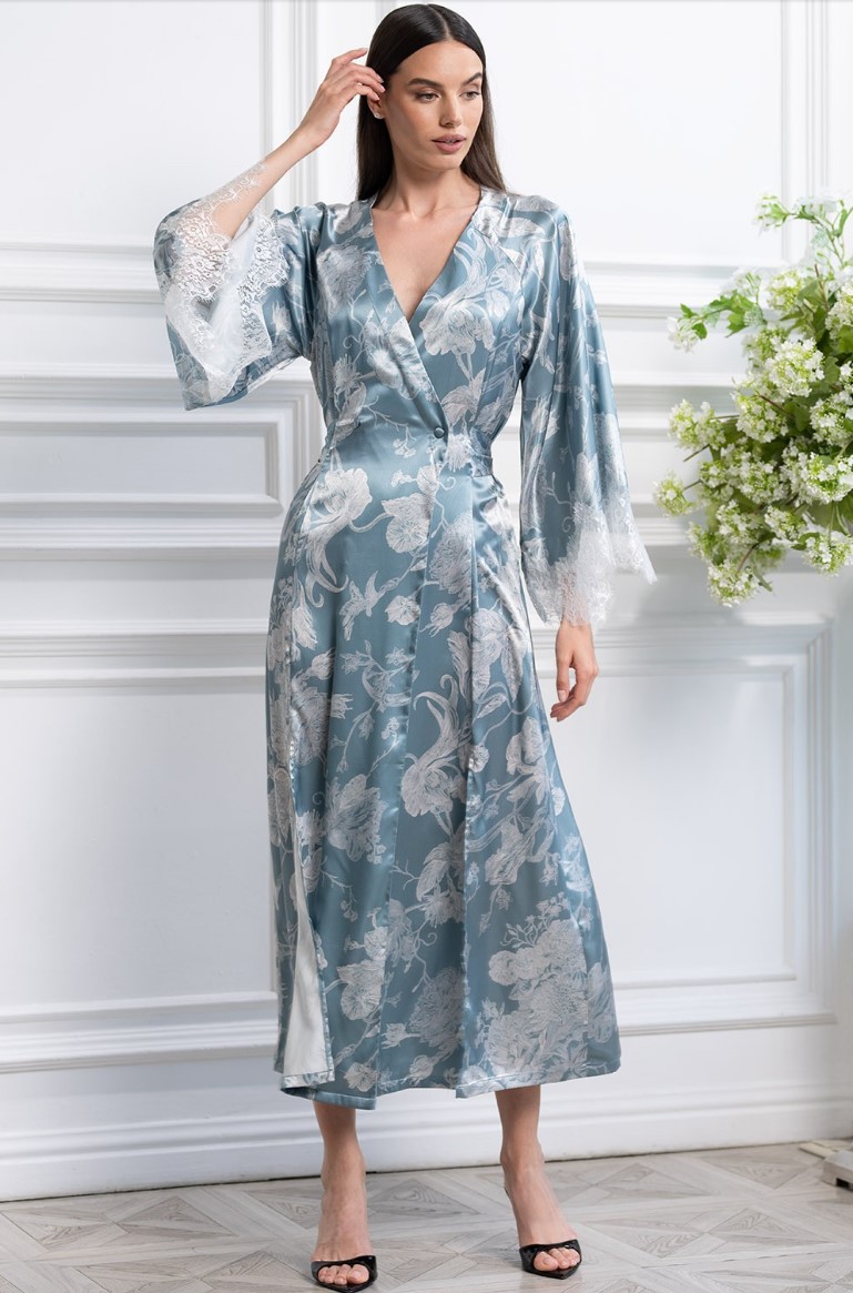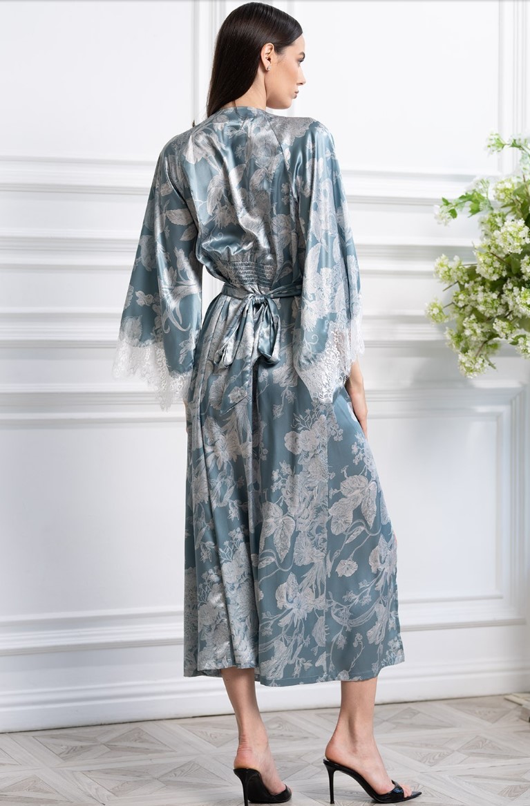 Длинный халат Mia-Amore выполнен из принтованного смесового шёлка. Халат по талии имеет застежку на пуговицы, спереди в рельефах разрезы, на спинке по талии декоративные буфы с резинкой, которые приталивают силуэт изделия, по талии широкий декоративный пояс, который можно завязать назад или вперёд. Рукава халата по низу украшены широким кружевом молочного цвета.