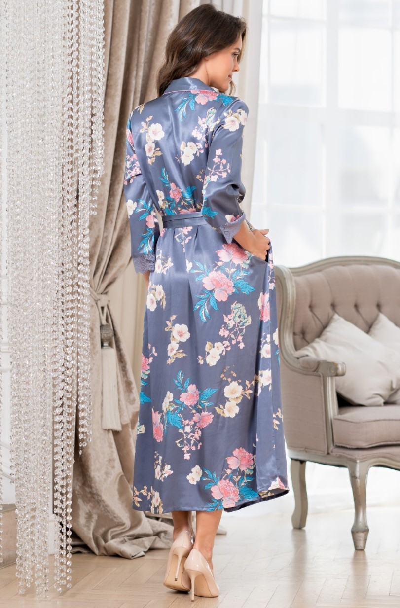 Длинный халат Mia-Amore на пуговицах с рукавом длиной 7/8, выполнен из принтованного смесового шелка и декорирован ажурным кружевом и контрастным кантом. По бокам обработаны карманы. Халат дополнен поясом.