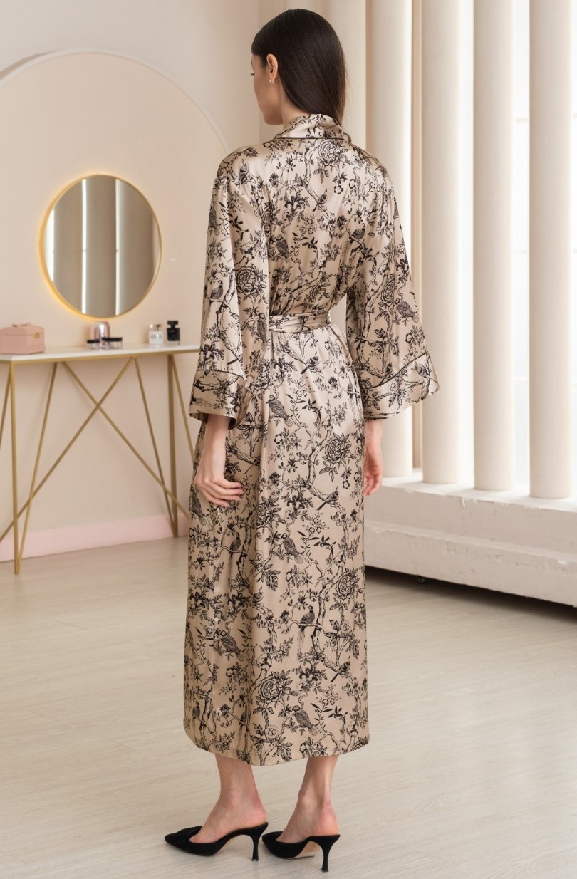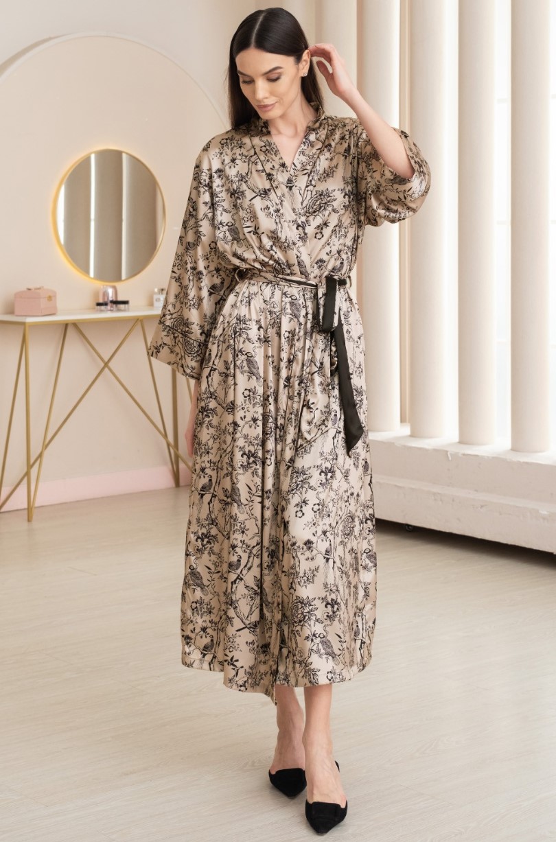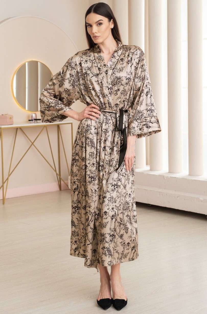 Длинный халат Mia-Amore из принтованного смесового шелка. Борта халата, притачные широкие манжеты на рукавах 7/8 декорированы тонким изящным кантом. В комплекте идет пояс. По бокам расположены карманы.