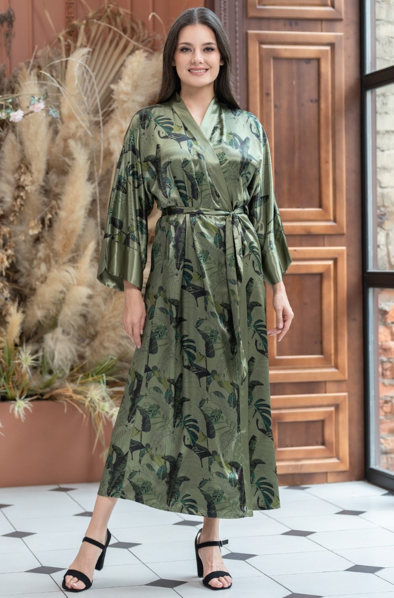 Длинный халат-кимоно Mia-Amore с широким рукавом длиной 3/4 . Халат выполнен из принтованного смесового шелка с однотонной отделкой. По бокам модели обработаны карманы.