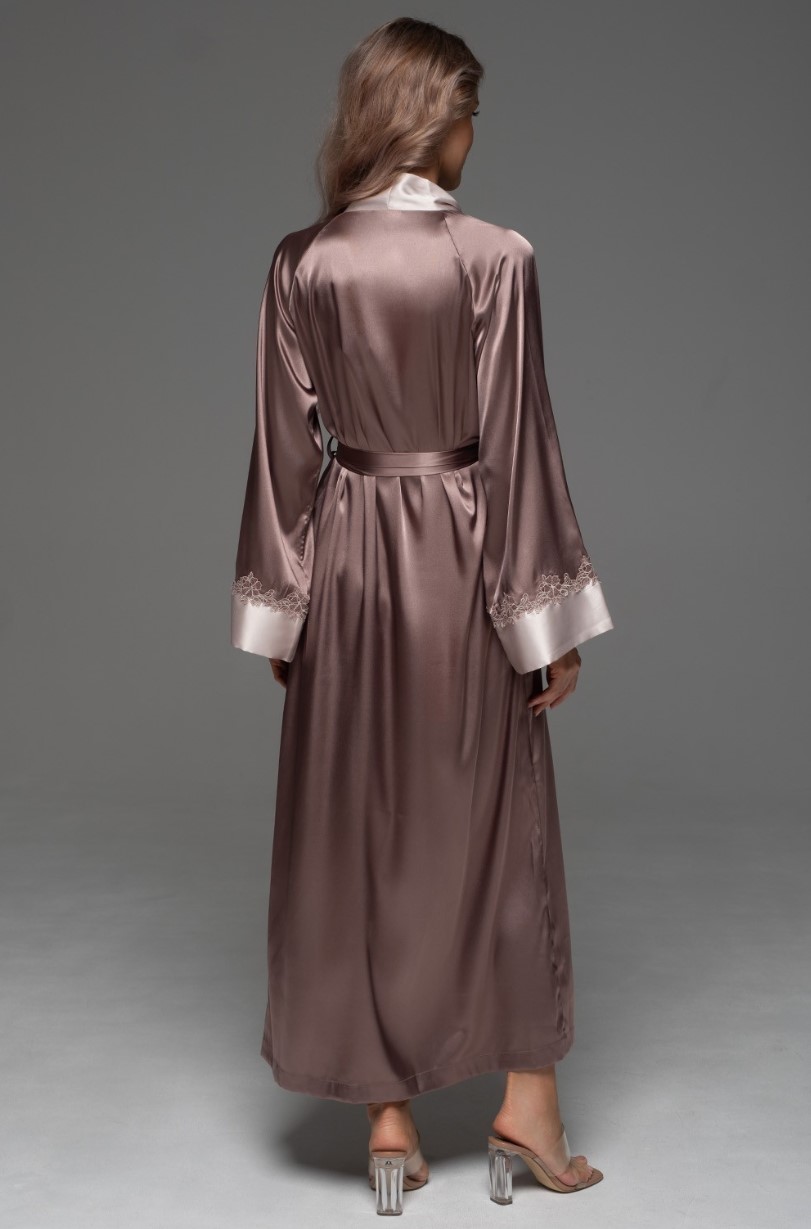 Длинный запашной халат Mia-Amore с длинными рукавами выполнен из однотонного смесового шёлка. Рукава декорированы по низу широким манжетом из перламутрового шёлка и ажурным кружевом. Планка халата также контрастного перламутрового цвета. Халат комплектуется широким поясом, в боковых швах карманами.