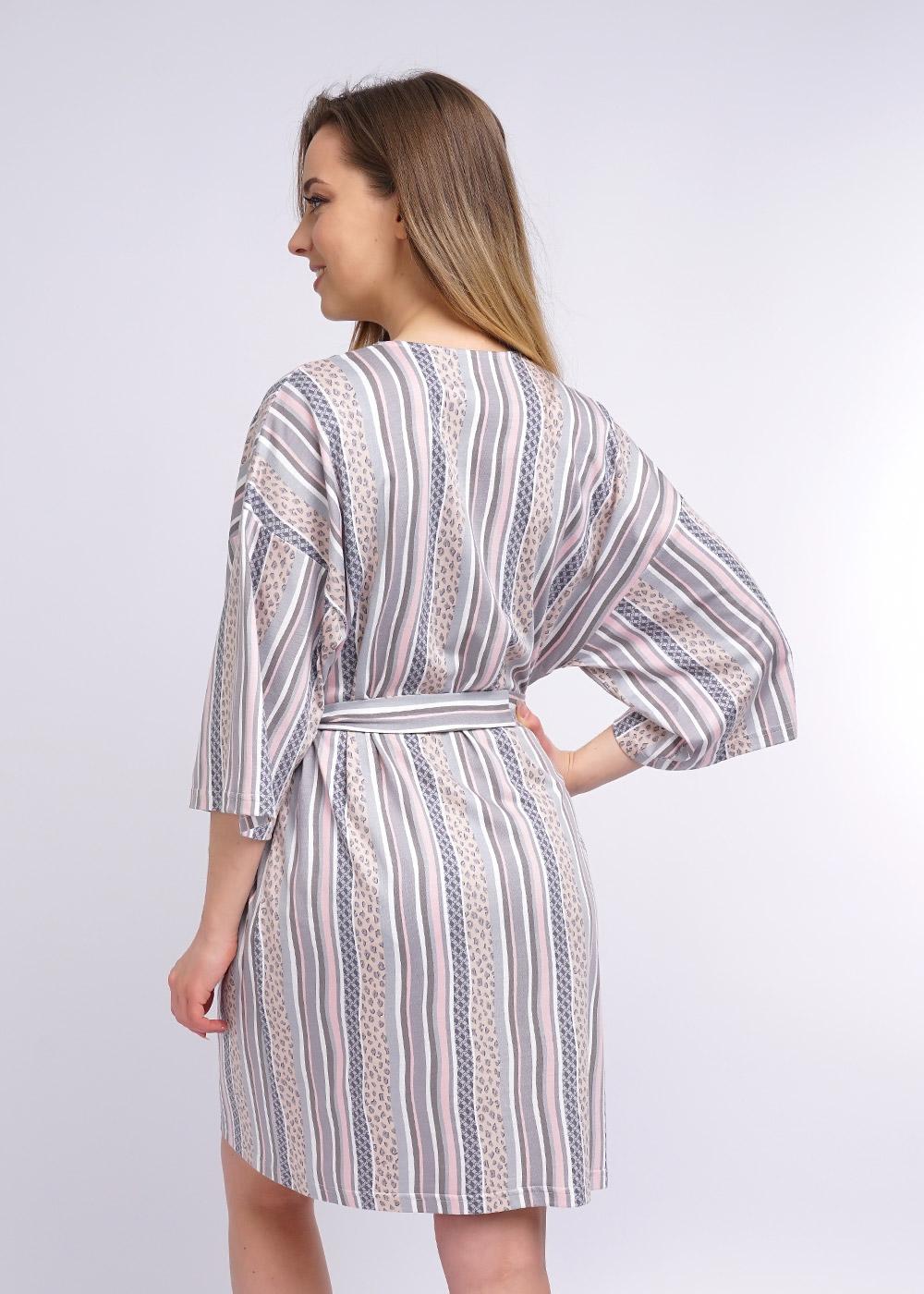 Халат-кимано из трикотажного полотна. Спущенная линия плеча, короткий рукав. По талии съёмный пояс, вставлен в шлёвки по бокам.