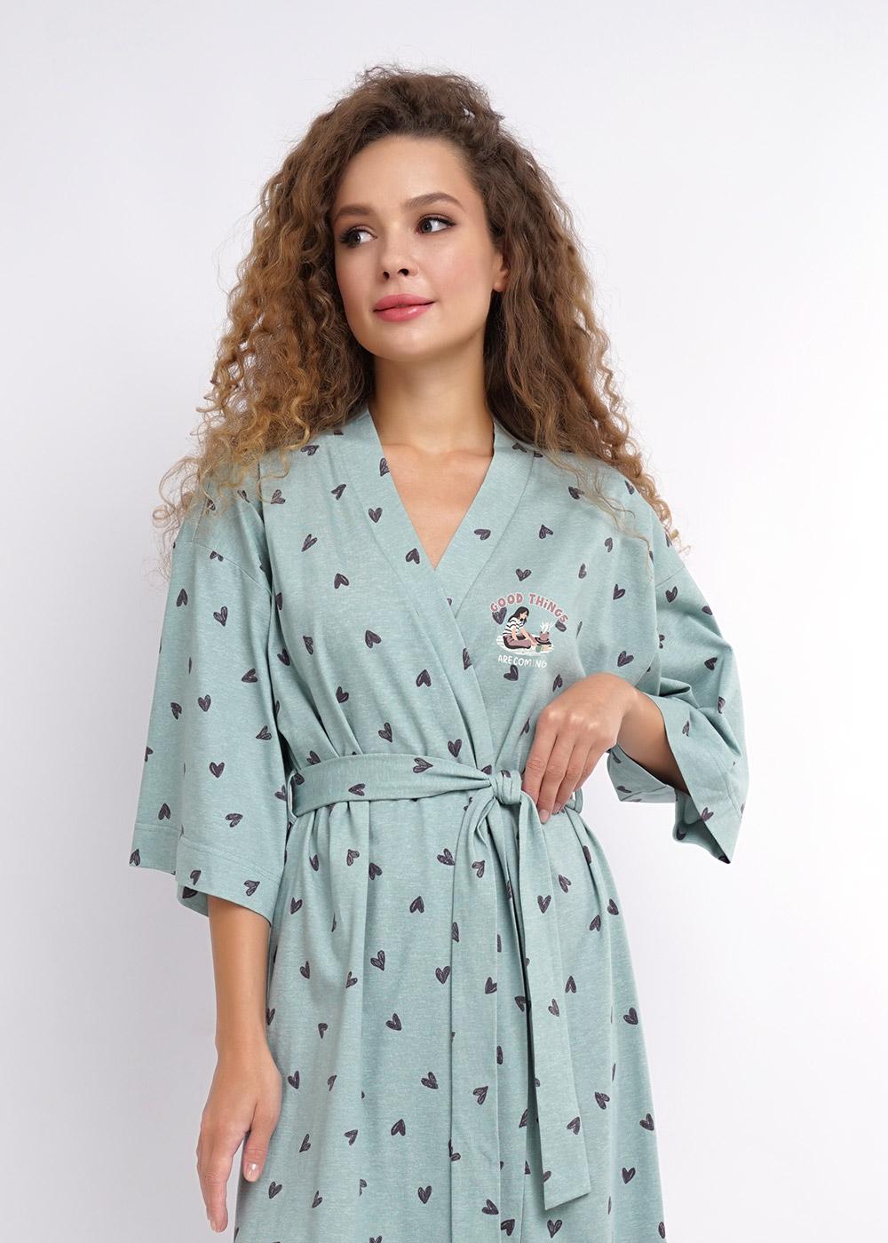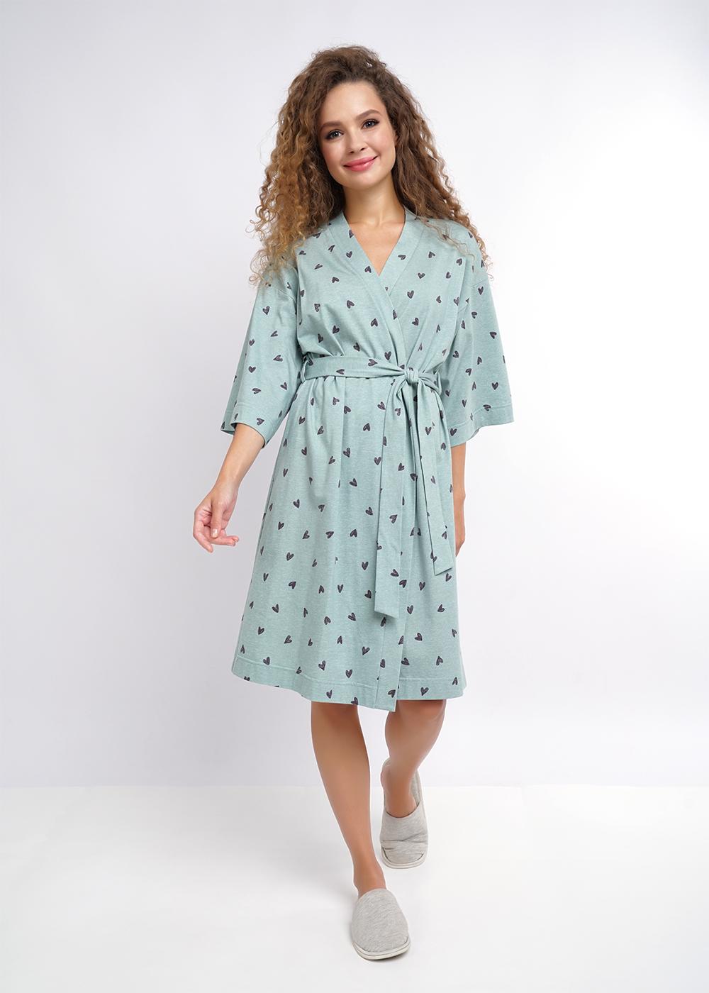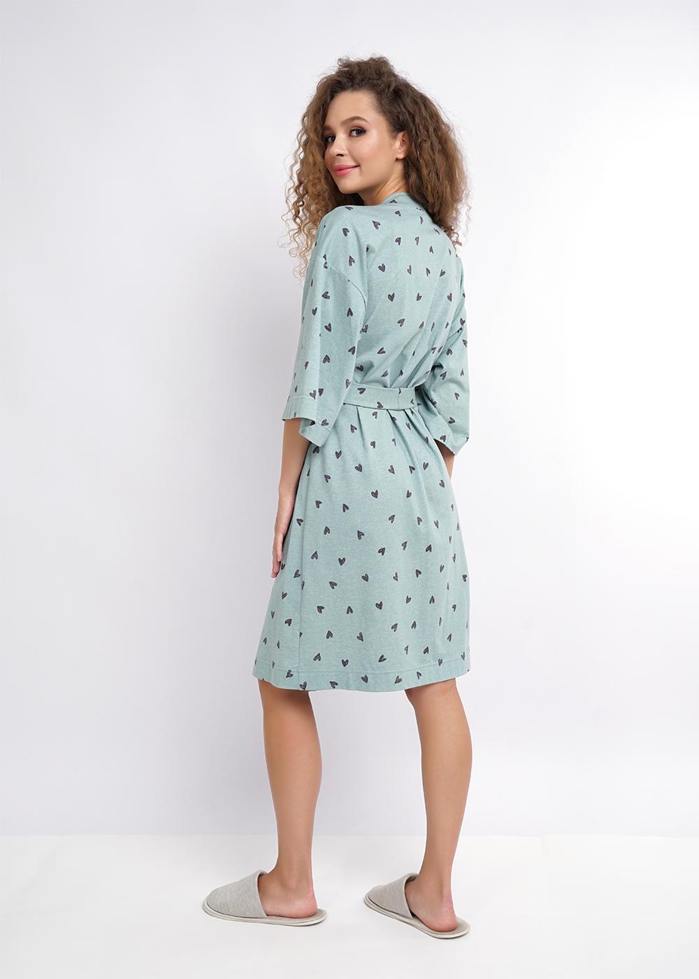 Халат-кимоно со спущенной линией плеча и длинным рукавом дополнен съёмным поясом, вставленым в шлёвки по бокам. Карманы в боковых швах. Горловина и борт обработаны обтачкой.