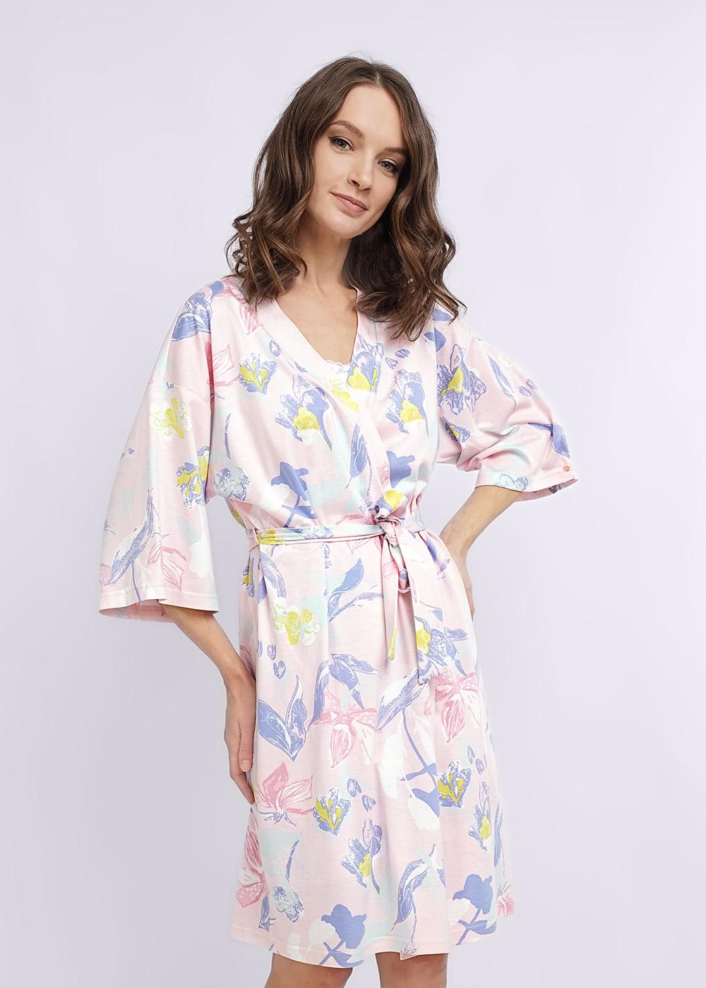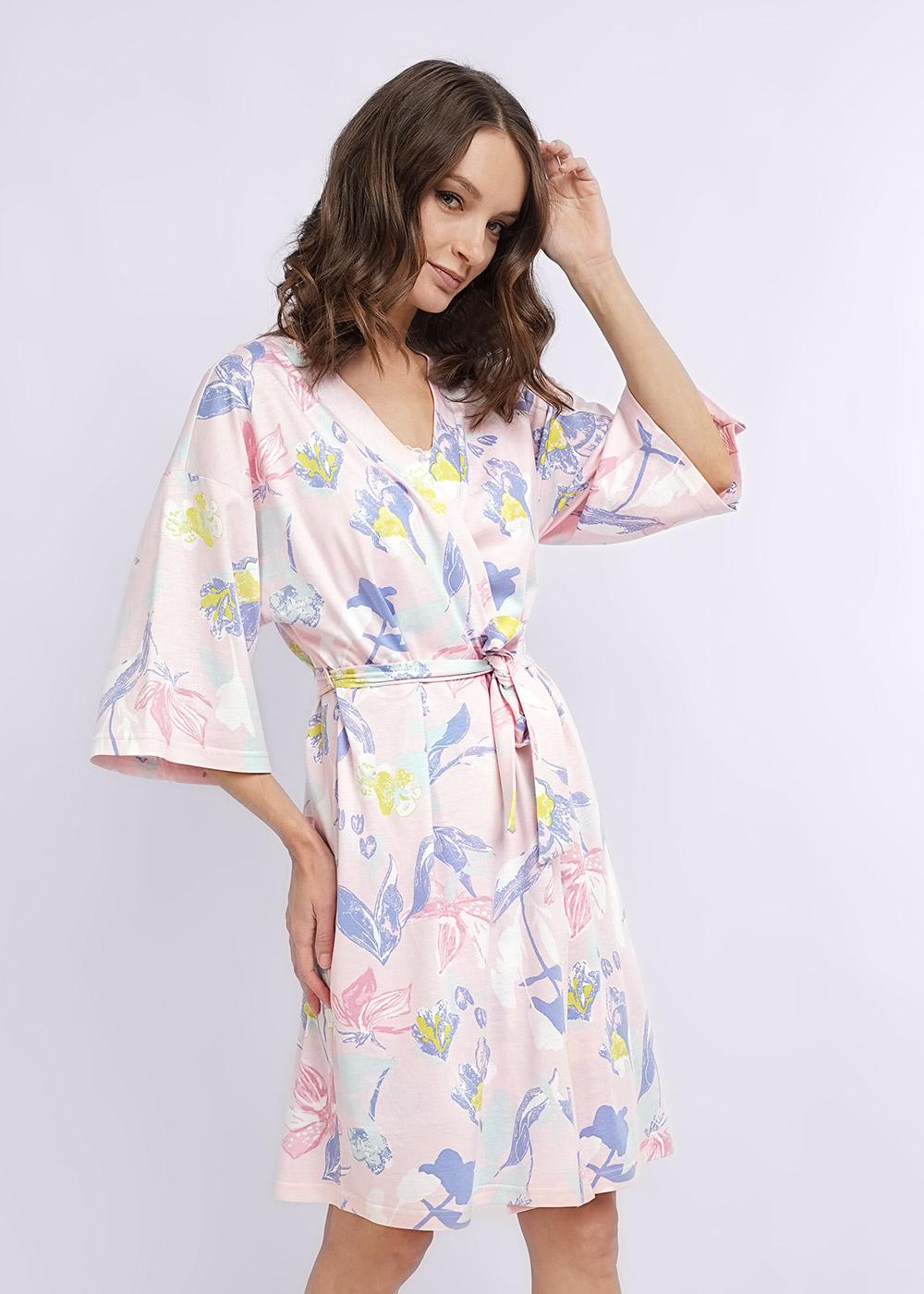 Халат-кимано из ткани хлопок-модал. Спущенная линия плеча. По талии съёмный пояс, вставлен в шлёвки по бокам. На борту пришивной декор.
