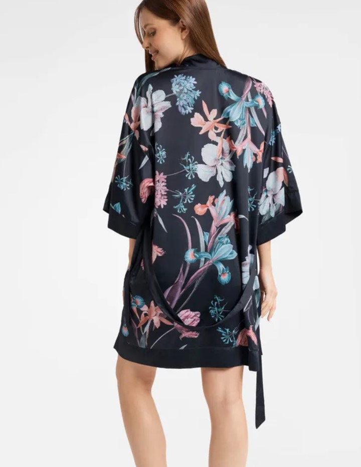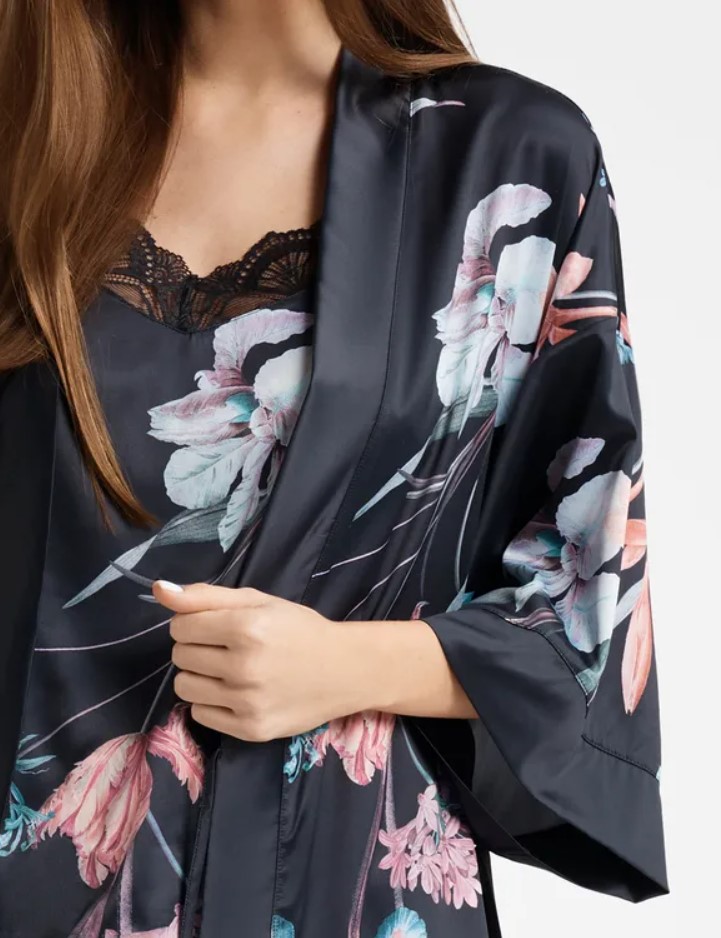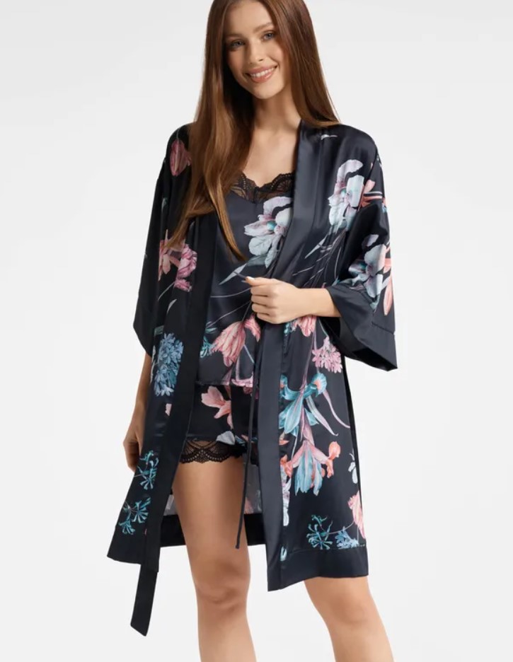 Нежный женский халат Lover порадует любую любительницу восточного дизайна. Это интересный дизайн кимоно, в котором воздушность атласа сочетается с цветочным принтом. Выбирайте женский халат Lover с рукавом 3/4 и получите комплект летних пижам из этой же коллекции.
