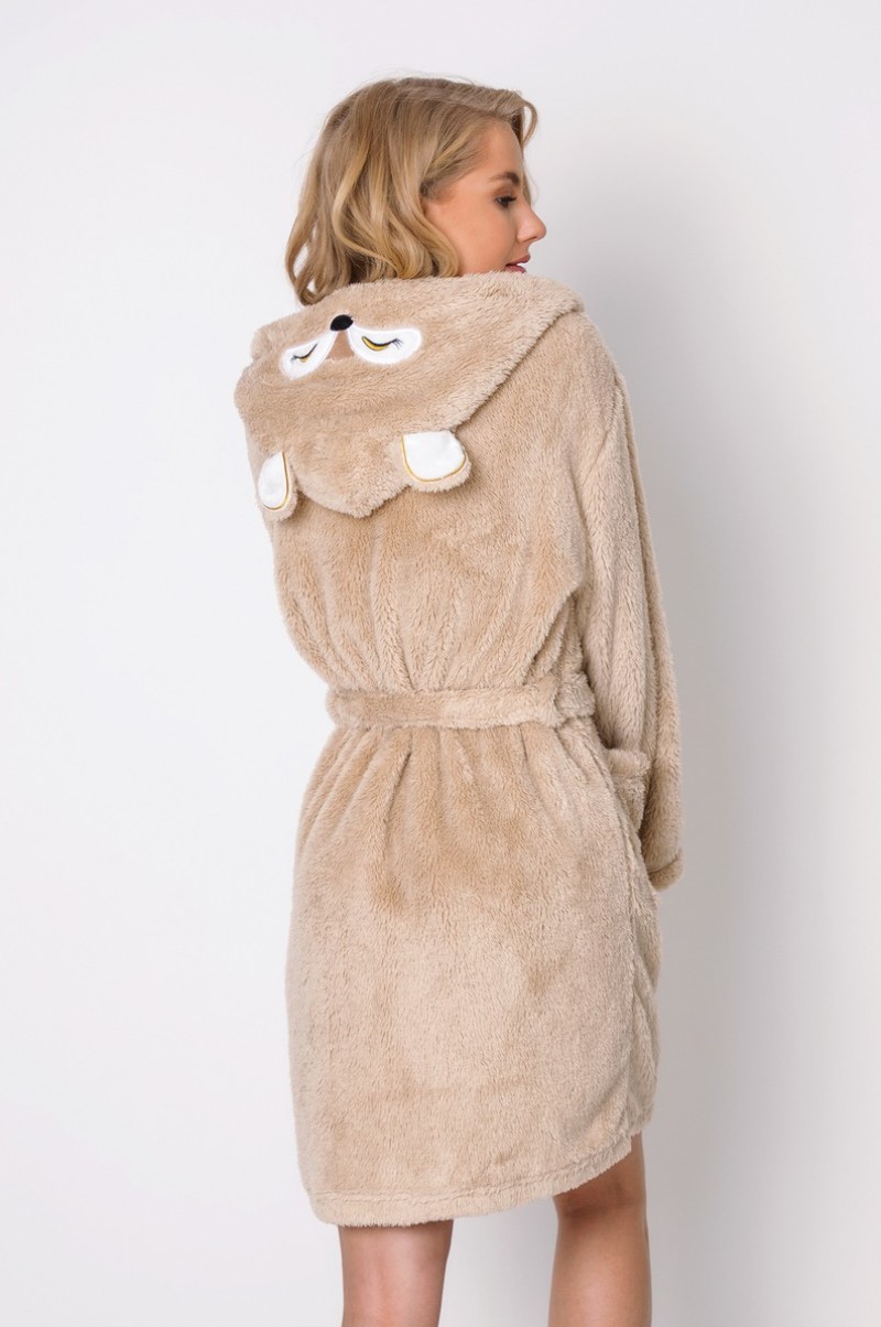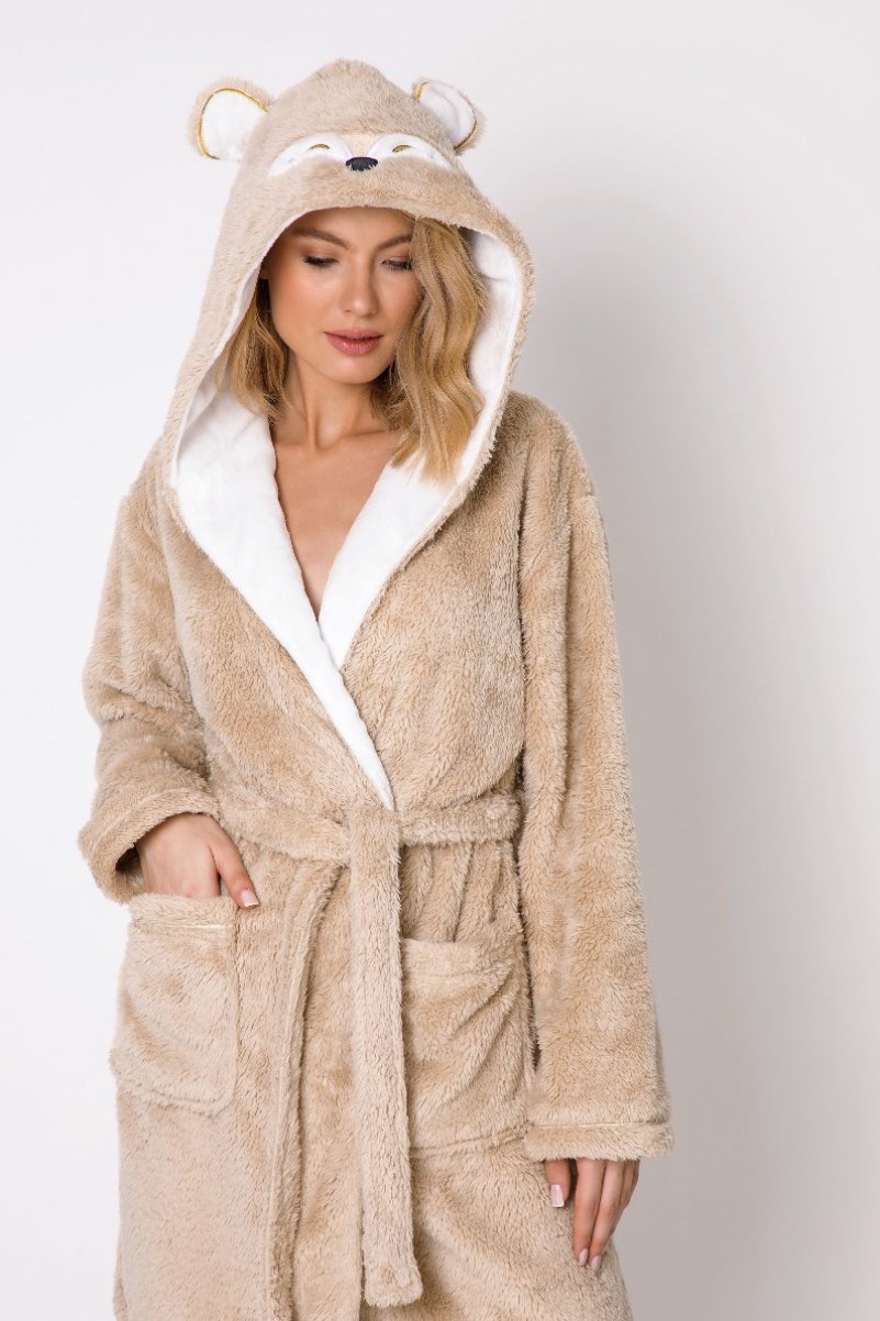 Мягкий женский халат с капюшоном, накладными карманами и поясом. Капюшон с ушками. Длина - выше колен.